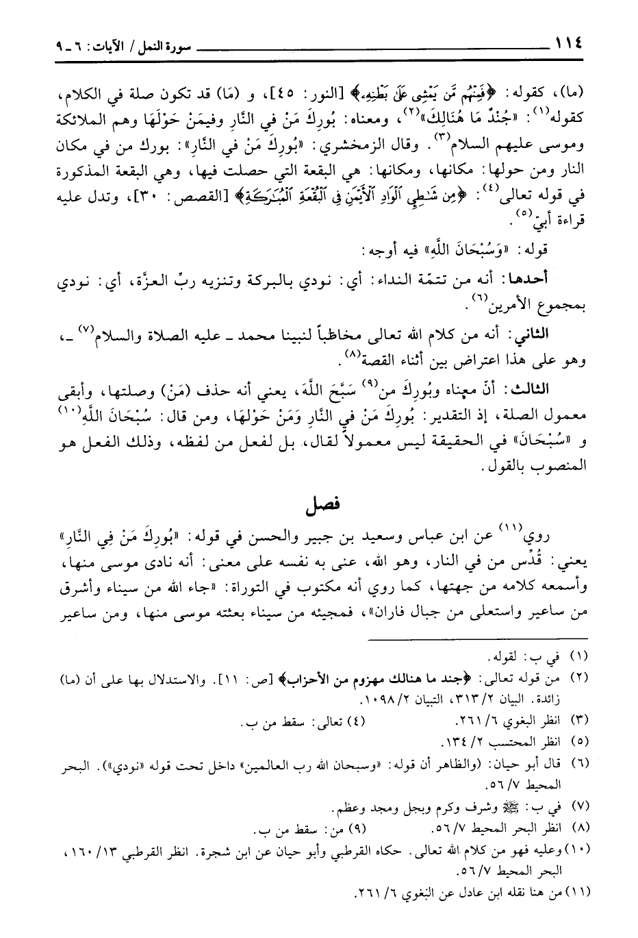 الثالث: أنّ معناه وبُورِكَ من سَبَّحَ اللَّهَ، يعني أنه حذف (مَنْ) وصلتها، وأبقى معمول الصلة، إذ التقدير: بُورِكَ مَنْ في النَّارِ وَمَنْ حَوْلَهَا، ومن قال: سُبْحَانَ اللَّهِ و «سُبْحَانَ» في الحقيقة ليس معمولاً لقال، بل لفعل من لفظه، وذلك الفعل هو المنصوب بالقول.