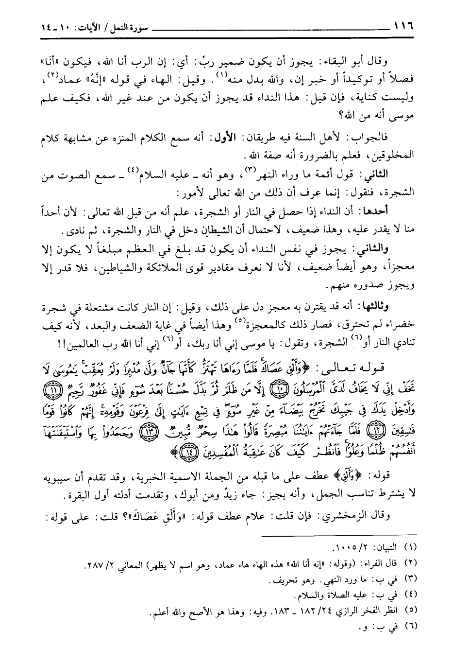 وقال أبو البقاء: يجوز أن يكون ضمير ربِّ: أي: إن الرب أنا الله، فيكون «أنَا» فصلاً أو توكيداً أو خبر إن، والله بدل منه. وقيل: الهاء في قوله «إنَّهُ» عماد، وليست كناية، فإن قيل: هذا النداء قد يجوز أن يكون من عند غير الله، فكيف علم موسى أنه من الله؟
