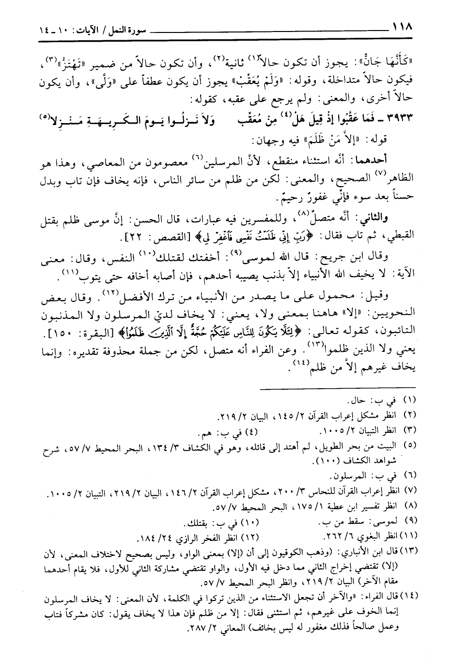 وقيل: محمول على ما يصدر من الأنبياء من ترك الأفضل. وقال بعض النحويين: «إلا» هاهنا بمعنى ولا، يعني: لا يخاف لديّ المرسلون ولا المذنبون التائبون، كقوله تعالى: {لِئَلاَّ يَكُونَ لِلنَّاسِ عَلَيْكُمْ حُجَّةٌ إِلاَّ الذين ظَلَمُواْ} [البقرة: 150] . يعني ولا الذين ظلموا. وعن الفراء أنه متصل، لكن من جملة محذوفة تقديره: وإنما يخاف غيرهم إلاَّ من ظلم.