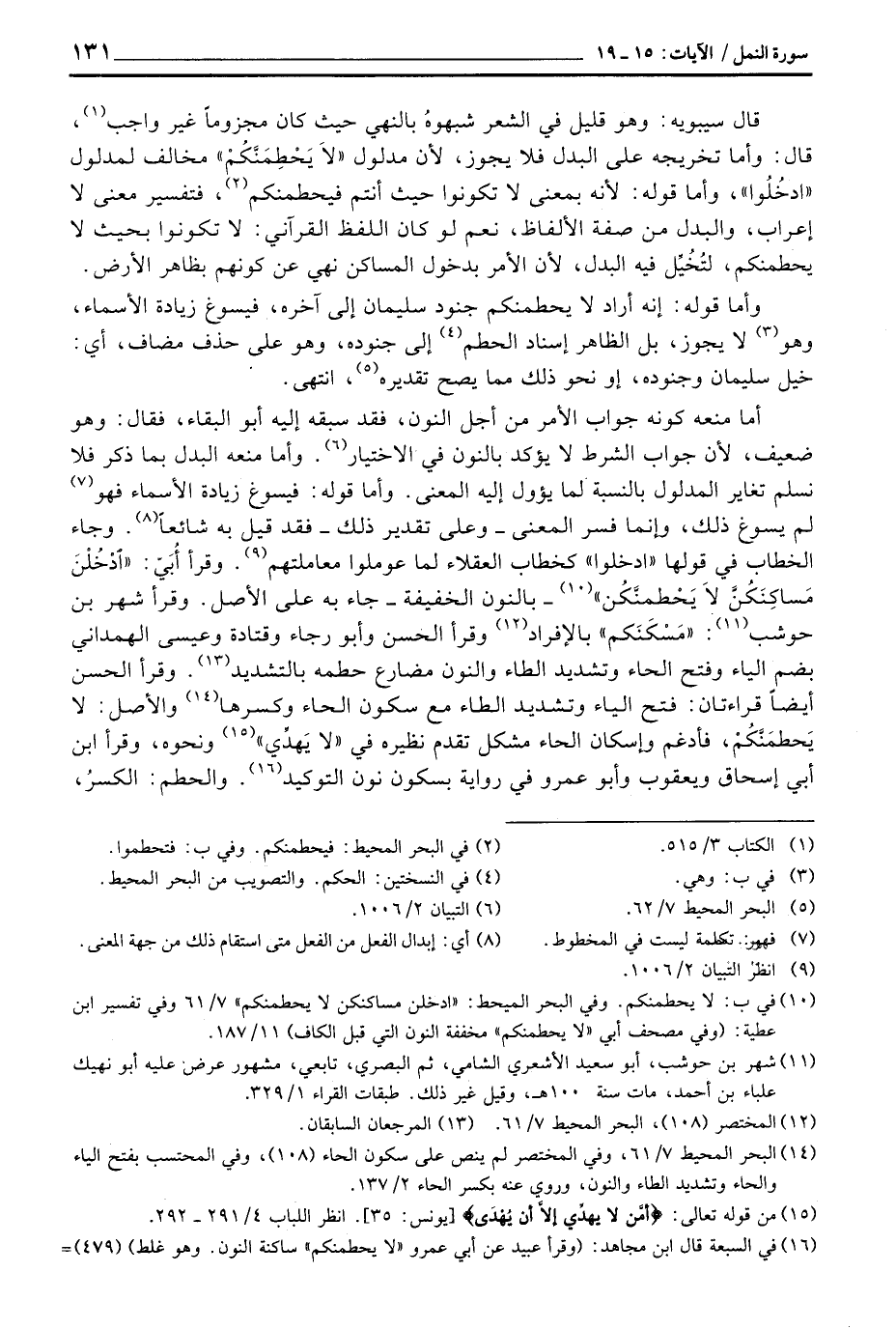 أما منعه كونه جواب الأمر من أجل النون، فقد سبقه إليه أبو البقاء، فقال: وهو ضعيف، لأن جواب الشرط لا يؤكد بالنون في الاختيار. وأما منعه البدل بما ذكر فلا نسلم تغاير المدلول بالنسبة لما يؤول إليه المعنى. وأما قوله: فيسوغ زيادة الأسماء فهو لم يسوغ ذلك، وإنما فسر المعنى - وعلى تقدير ذلك - فقد قيل به شائعاً. وجاء الخطاب في قولها «ادخلوا» كخطاب العقلاء لما عوملوا معاملتهم. وقرأ أُبَيّ: {ادْخُلْنَ مَساكِنَكُنَّ لاَ يَحْطمنَّكُن} - بالنون الخفيفة - جاء به على الأصل. وقرأ شهر به حوشب: «مَسْكَنَكم» بالإفراد وقرأ الحسن وأبو رجاء وقتادة وعيسى الهمداني بضم الياء وفتح الحاء وتشديد الطاء والنون مضارع حطمه بالتشديد. وقرأ الحسن أيضاً قراءتان: فتح الياء وتشديد الطاء مع سكون الحاء وكسرها والأصل: يَحطمَنَّكُمْ، فأدغم وإسكان الحاء مشكل تقدم نظيره في «لا يَهديِّي» ونحوه، وقرأ ابن أبي إسحاق ويعقوب وأبو عمرو في رواية بسكون نون التوكيد. والحطم: الكسرُ،