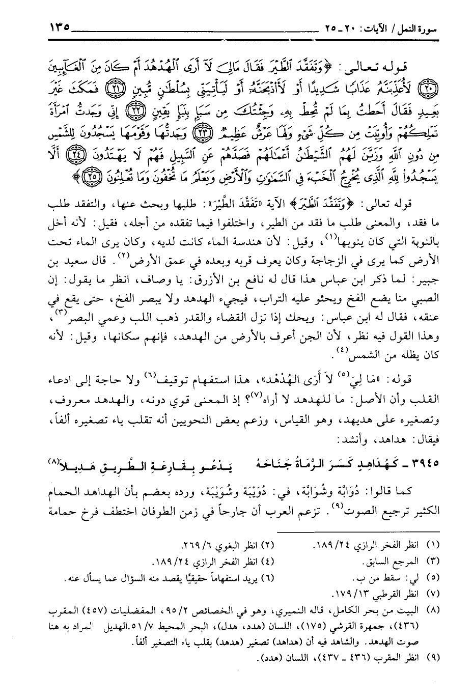 قوله تعالى: {وَتَفَقَّدَ الطير} الآية «تَفَقَّدَ الطَّيْرَ» : طلبها وبحث عنها وبحث عنها، والتفقد طلب ما فقد، والمعنى طلب ما فقد من الطير، واختلفوا فيما تفقده من أجله، فقيل: لأنه أخل بالنوبة التي كان ينوبها، وقيل: لأن هندسة الماء كانت لديه، وكان يرى الماء تحت الأرض كما يرى في الزجاج وكان يعرف قربه وبعده في عمق الأرض. قال سعيد بن جبير: لما ذكر ابن عباس هذا قال له نافع بن الأزرق: يا وصاف، انظر ما يقول: إن الصبي منا يضع الفخ ويحثو عليه التراب، فيجيء الهدهد ولا يبصر الفخ، حتى يقع في عنقه، فقال له ابن عباس: ويحك إذا نزل القضاء والقدر ذهب اللب وعمي البصر، وهذا القول فيه نظر، لأن الجن أعرف بالأرض من الهدهد، فإنهم سكانها، وقيل: لأنه كان يظله من الشمس.