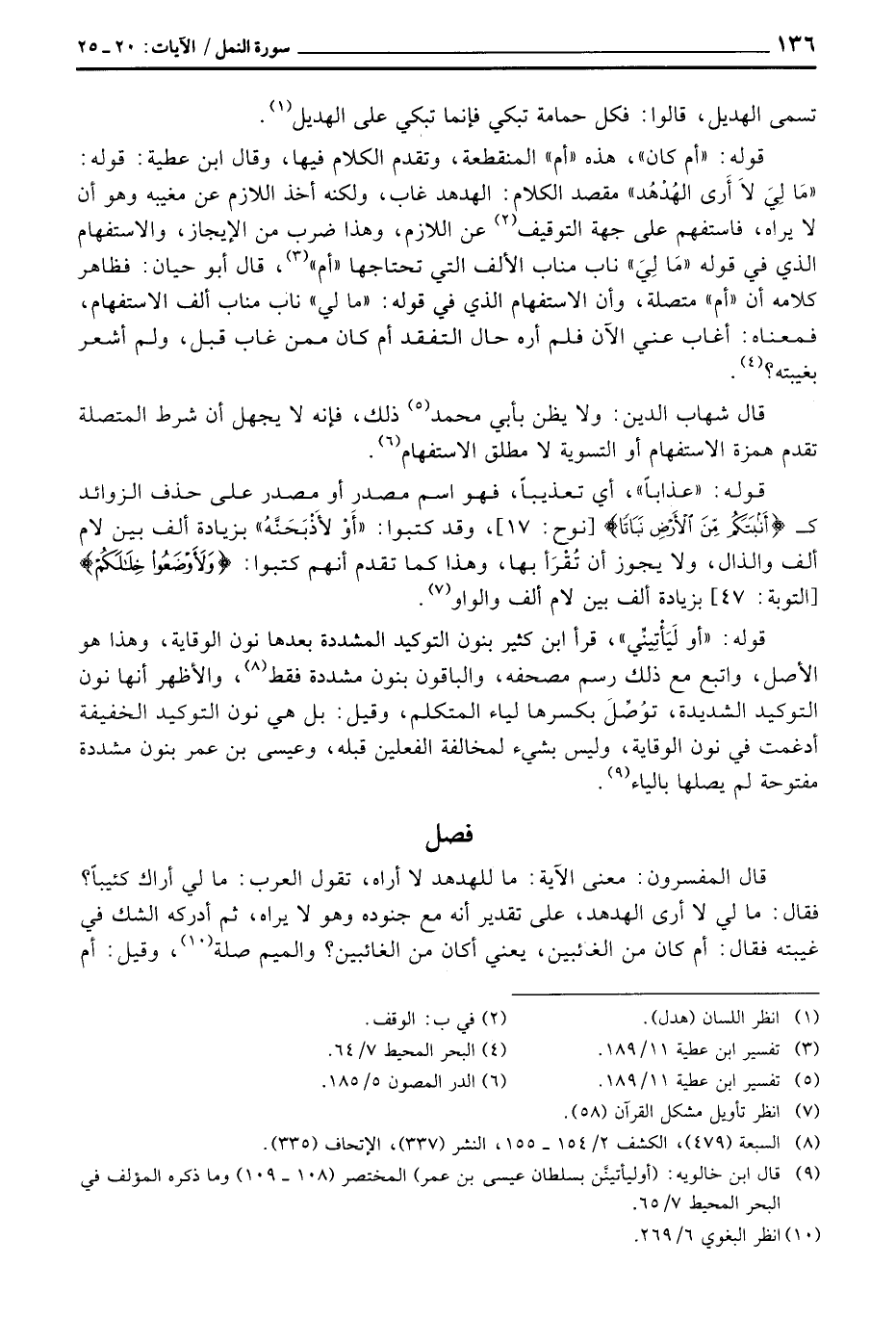 قوله: «أم كان» ، هذه «أم» المنقطعة، وتقدم الكلام فيها، وقال ابن عطية: قوله {مَالِيَ لاَ أَرَى الهدهد} مقصد الكلام: الهدهد غاب، ولكنه أخذ اللازم عن مغيبه وهو أن لا يراه، فاستفهم على جهة التوقيف عن اللازم، وهذا ضرب من الإيجاز، والاستفهام الذي في قوله «مَالِيَ» ناب مناب الألف التي تحتاجها «أم» ، قال أبو حيان: فظاهر كلامه أن «أم» متصلة، وأن الاستفهام الذي في قوله: «مالي» ناب مناب ألف الاستفهام، فمعناه: أغاب عني الآن فلم أره حال التفقد أم كان ممن غاب قبل، ولم أشعر بغيبته؟ .