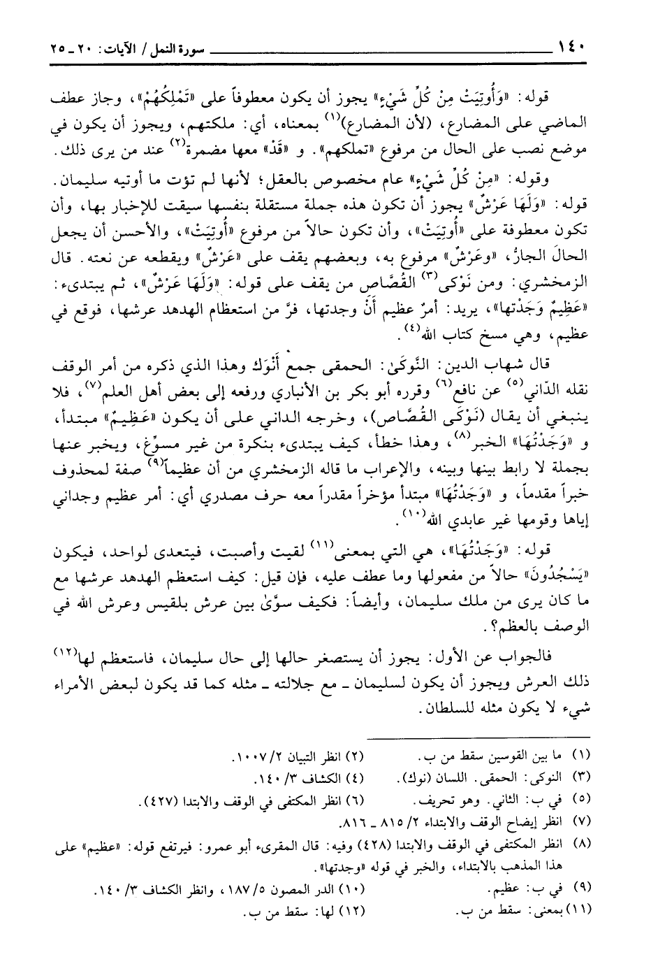 قال شهاب الدين: النَّوكَى: الحمقى جمع َنْوَك وهذا الذي ذكره من أمر الوقف نقله الدّاني عن نافع وقرره أبو بكر بن الأنباري ورفعه إلى بعض أهل العلم، فلا ينبغي أن يقال (نَوْكَى القُصَّاص) ، وخرجه الداني على أن يكون «عَظِيمٌ» مبتدأ، و «وَجَدْتُهَا» الخبر، وهذا خطأ، كيف يبتدىء بنكرة من غير مسوِّغ، ويخبر عنها بجملة لا رابط بينهما وبينه، والإعراب ما قاله الزمخشري من أن عظيماً صفة لمحذوف خبراً مقدماً، و «وَجَدْتُهَا» مبتدأ مؤخراً مقدراً معه حرف مصدري أي: أمر عظيم وجداني إياها وقومها غير عابدي الله.