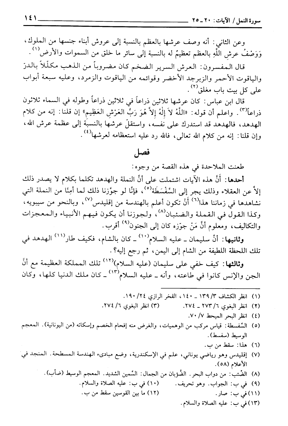 أحدها: أَنَّ هذه الآيات اشتملت على أنَّ النملة والهدهد تكلما بكلام لا يصدر ذلك إلاَّ عن العقلاء وذلك يجر إلى السَّفْسَطَة، فإنَّا لوجوَّزنا ذلك لما أمِنّا من النملة التي نشاهدها في زماننا هذا أَنْ تكون أعلم بالهندسة من إقليدس، وبالنحو من سيبويه، وكذا القول في القملة والضئبان، ولجوزنا أن يكون فيهم الأنبياء والمعجزات والتكاليف، ومعلوم أنَّ مَنْ جوّزه كان إلى الجنون أقرب.