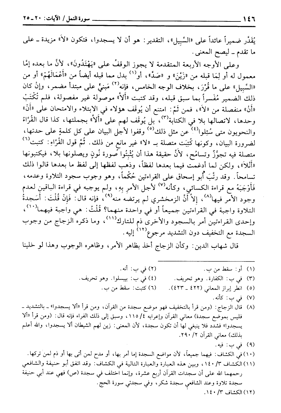 وعلى الأوجه الأربعة المتقدمة لا يجوز الوقفُ على «يَهْتَدُونَ» ، لأنَّ ما بعده إمَّا معمول له أو لِمَا قبله من «زَيَّنَ» وصَدَّ «أو بدل مما قبله أيضاً من» أَعْمَالَهُمْ «أو من» السَّبِيل «على ما قُرِّرَ، بخلاف الوجه الخامس، فإنه مَبنيٌّ على مبتدأ مضمر، وإنْ كان ذلك الضمير مُفَسراً بما سبق قبله، وقد كتبت» أَلاَّ «مصولة غير مفصولة، فلم تُكْتَبْ» أَنْ «منفصلة من» لاَ «، فمن ثَمَّ: امتنع أن يُوقَف هؤلاء في الابتلاء والامتحان على» أَنْ «وحدها، لاتصالها بلا في الكتابة، بل يُوقَف لهم على» أَلاَّ «بجملتها، كذا قال القُرَّاءُ، والنحويون متى سُئِلوا عن مثل ذلك وقفوا لأجل البيان على كل كلمةٍ على حدتها. لضرورة البيان، كونها كُتِبَت متصلة ب» لا «غير مانعٍ من ذلك. ثُمَّ قول القُرَّاءِ: كتبت متصلة فيه تجوُّزٌ وتسامُح، لأَنَّ حقيقة هذا أن يُثْبِتُوا صورة نُونٍ ويصلونها بلاء، فيكتبونها» أَنْلاَ «، ولكن لما أدغمت فيما بعدها لفظاً، وذهب لفظها إلى لفظ ما بعدها قالوا ذلك تسامحاً. وقد رتَّبَ أبو إسحاق على القراءتين حُكْماً، وهو وجوب سجود التلاوة وعدمه، فَأَوْجَبَهُ مع قراءة الكسائي، وكأنه لأجل الأمرِ بِهِ، ولم يوجبه في قراءة الباقين لعدم وجود الأمر فيها، إِلاَّ أَنَّ الزمخشري لم يرتضه منه، فإنه قال: فَإِنْ قُلْتَ: أَسَجدةُ التلاوة واجبة في القراءتين جميعاً أو في واحدة منهما؟ قُلْتُ: هي واجبة فيهما.