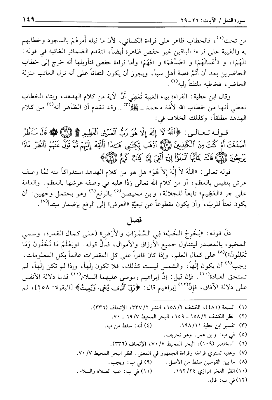 وقال ابن عطية: القراءة بيان الغيبة تُعْطِي أَنَّ الية من كلام الهدهد، وبتاء الخطاب تعطي أنها من خطاب الله لأُمّة محمد - صَلَّى اللَّهُ عَلَيْهِ وَسَلَّم َ - وقد تقدم أن الظاهر أنه من كلام الهدهد مطلقاً.