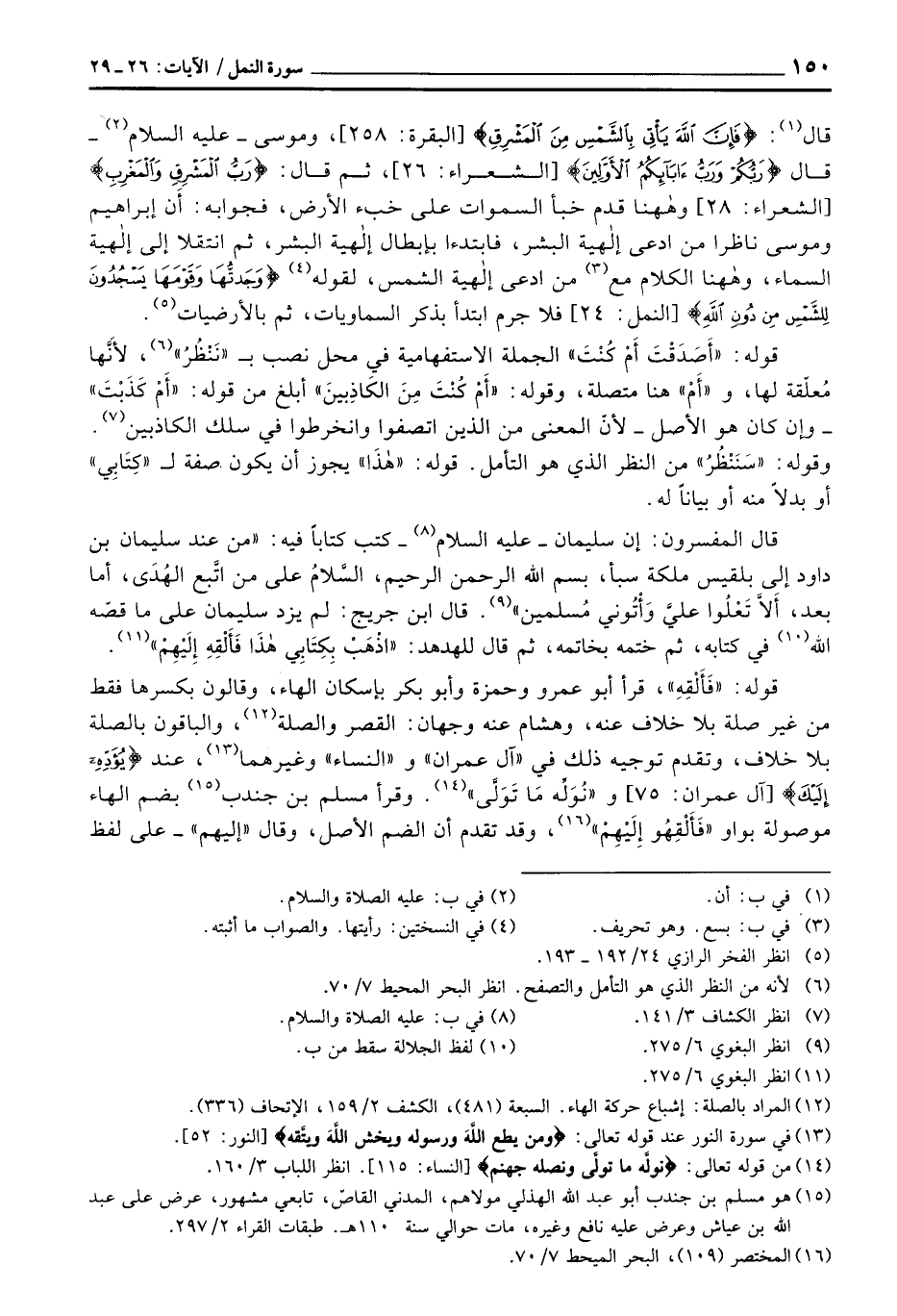 قوله: {أَصَدَقْتَ أَمْ كُنتَ} الجملة الاستفهامية في محل نصب ب «نَنْظُرُ» ، لأنَّها مُعلّقة لها، و «أَمْ» هنا متصلة، وقوله: {أَصَدَقْتَ أَمْ كُنتَ مِنَ الكاذبين} أبلغ من قوله: «أَمْ كَذَبْتَ» - وإن كان هو الأصل - لأنّ المعنى من الذين اتصفوا وانخرطوا في سلك الكاذبين. وقوله: «سَنَنْظُرُ» من النظر الذي هو التأمل. قوله: «هذَا» يجوز أن يكون صفة ل «كِتَابِي» أو بدلاً منه أو بياناً له.