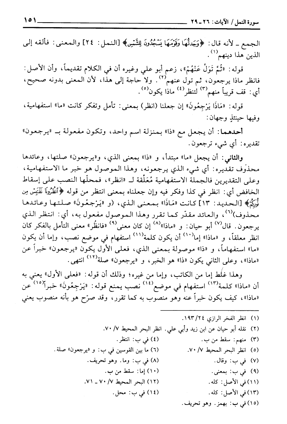 والثاني: أن يجعل «ما» مبتدأ، و «ذا» بمعنى الذي، و «يرجعون» صلتها، وعائدها محذوف تقديره: أي شيء الذي يرجعونه، وهذا الموصول هو خبر ما الاستفهامية وعلى التقديرين فالجملة الاستفهامية مُعَلِّقة ل «انظر» فمحلّها النصب على إٍقاط الخافض أي: انظر في كذا وفكر فيه وإن جعلناه بمعنى انتظر من قوله {انظرونا نَقْتَبِسْ مِن نُّورِكُمْ} [الحديد: 13] كانت «مَاذَا» بمعنى الذي، (و «يَرْجعُونَ» صلتها وعائدها محذوف) ، والعائد مقدّر كما تقرر وهذا الموصول مفعول به، أي: انتظر الذي يرجعون. قال أبو حيان: و «ماذا» إن كان معنى «فانظُر» معنى التأمل بالفكر كان انظر معلقاً، و «ماذا» إما أن يكون كلمة استفهام في موضع نصب، وإما أن يكون «ما» استفهاما، و «ذا» موصولة بمعنى الذي، فعلى الأول يكون «يرجعون» خبراً عن «ماذا» ، وعلى الثاني يكون «ذا» هو الخبر، و «يرجعون» صلة انتهى.