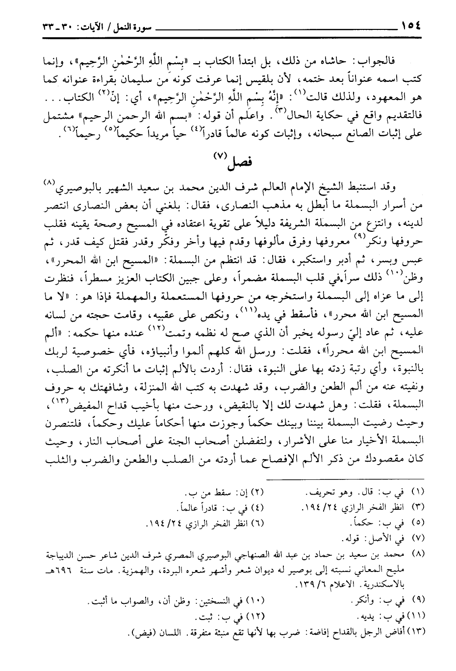 وقد استنبط الشيخ الإمام العالم شرف الدين محمد بن سعيد الشهير بالبوصيري من أسرار البسملة ما أبطل به مذهب النصارى، فقال: بلغني أن بعض النصارى انتصر لدينه، وانتزع من البسملة الشريفة دليلاً على تقوية اعتقاده في المسيح وصحة يقينه فقلب حروفها ونكر معروفها وفرق مألوفها وقدم فيها وأخر وفكّر وقدر فتقل كيف قدر، ثم عبس وبسر، ثم أدبر واستكبر، فقال: قد انتظم من البسملة: «المسيح ابن الله المحرر» . وظن ذلك سراً في قلب البسملة مضمراً، وعلى جبين الكتاب العزيز مسطراً، فنظرت إلى ما عزاه إلى البسملة واستخرجه من حروفها المستعملة والمهملة فإذا هو: «لا ما المسيح ابن الله محرر» ، فأسقط في يده، ونكص على عقبيه، وقامت حجته من لسانه عليه، ثم عاد إليّ رسوله يخبر أن الذي صح له نظمه وتمت عنده منها حكمه: «ألم المسيح ابن الله محرراً» ، فقلت: ورسل الله كلهم ألموا وأنبياؤه، فأي خصوصية لربك بالنبوة، وأي رتبة زدته بهاعلى النبوة، فقال: أردت بالألم إثبات ما أنكرته من الصلب، ونقيته عنه من ألم الطعن والضرب، وقد شهدت به كتب الله المنزلة، وشافهتك به حروف البسملة، فقلت: وهل شهدت لك إلا بالنقيض، ورحت منها بأخيب قداح المفيض، وحيث رضيت البسملة بيننا وبينك حكماً وجوزت منها أحكاماً عليك وحكماً، فالتنصرن البسملة الأخيار منا على الأشرار، ولتفضلن أصحاب الجن على أصحاب النار، وحيث كان مقصودك من ذكر الألم الإفصاح عما أردته من الصلب والطعن والضرب والثلب