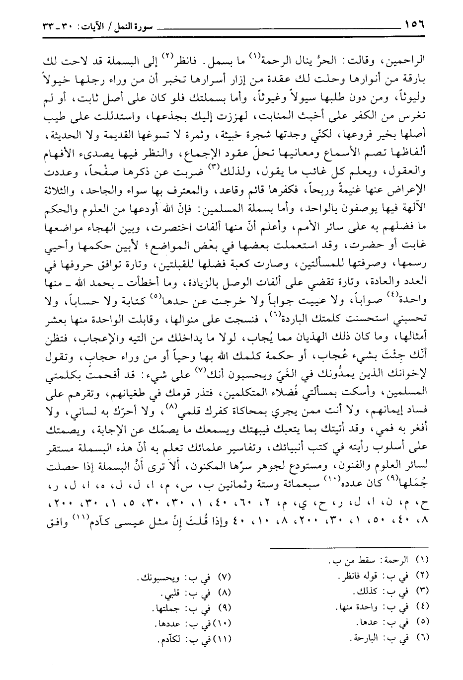 الراحمين، وقالت: الحرُّ ينال الرحمة ما بسمل. فانظر إلى البسملة قد لاحت لك بارقة من أنوارها وحلت لك عقدة من إزار أسرارها تخبر أن من وارء رجلها خيولاً وليوثاً، ومن دون طلبها سيولاً وغيوثاً، وأما بسملتك فلو كان على أصل ثابت، أو لم تغرس من الكفر على أخبث المنابت، لهززت إليك بجذعها، واستدللت عل طيب أصلها بخير فروعها، لكنّي ودتها شجرة خبيثة، وثمرة لا تسوغها القديمة ولا الحديثة، ألفاظها تصم الأسماع ومعانيها تحلّ عقود الإجماع، والنظر فيها يصدىء الأفهام والعقول، ويعلم كل غائب ما يقول، ولذلك ضربت عن ذكرها صفْحاً، وعددت الإعراض عنها غنيمةً وربحاً، فكفرها قائم وقاعد، والمعترف بها سواء والجاحد، والثلاثة الآلهة فيها يوصفون بالواحد، وأما بسملة المسلمين: فإنّ الله أودعها من العلوم والحكم ما فضلهم به على سائر الأمم، وأعلم أنّ منها ألفات اختصرت، وبين الهجاء مواضعها غابت أو حضرت، وقد استعملت بعضها في بعض المواضع؛ لأبين حكمها وأحيي رسمها، وصرفتها للمسألتين، وصارت كعبة فضلها للقبلتين، وتارة توافق حروفها في العدد والعادة، وتارة تقضي على ألفات الوصل بالزيادة، وما أخطأت - بحمد الله - منها واحدة صواباً، ولا عييت جواباً ولا خرجت عن حدها كتابة ولا حساباً، ولا تحسبني استحسنت كلمتك الباردة، فنسجت على منوالها، وقابلت الواحدة منها بعشر أمثالها، وما كان ذلك الهذيان مما يُجاب، لولا ما يداخلك من التيه والإعجاب، فتظن أنّك جِئْتَ بشيء عُجاب، أو حكمة كلمك الله بها وحياً أو من وراء حجابٍ، وتقول لإخوانك الذين يمدُّونك في الغَيّ ويحسبون أنك على شيء: قد أفحمت بكلمتي المسلمين، وأسكت بمسألتي فُضلاء المتكلمين، فتذر قومك في طغيانهم، وتقرهم على فساد إيمانهم، ولا أنت ممن يجري بمحاكاة كفرك قلمي، ولا أحرّك به لساني، ولا أفغر به فمي، وقد أتيتك بما يتعبك فيبهتك ويسمعك ما يصمّك عن الإجابة، ويصمتك على أسلوب رأيته في كتب أنبيائك، وتفاسير علمائك تعلم به أنّ هذه البسملة مستقر لسائر العلوم والفنون، ومستودع لجوهر سرِّها المكنون، أَلاَ ترى أَنَّ البسملة إذا حصلت جُمَلها كان عدده سبعمائة وستة وثمانين ب، س، م، ا، ل، ل، هـ، ا، ل، ر، ح، م، ن، ا، ا، ل، ر، ح، ي، م، 2، 60، 40، 1، 30، 30، 5، 1، 30، 200، 8 40، 50، 1، 30، 200، 8، 10، 40 وإذا قُلتَ إِنّ مثل عيسى كآدم وافق