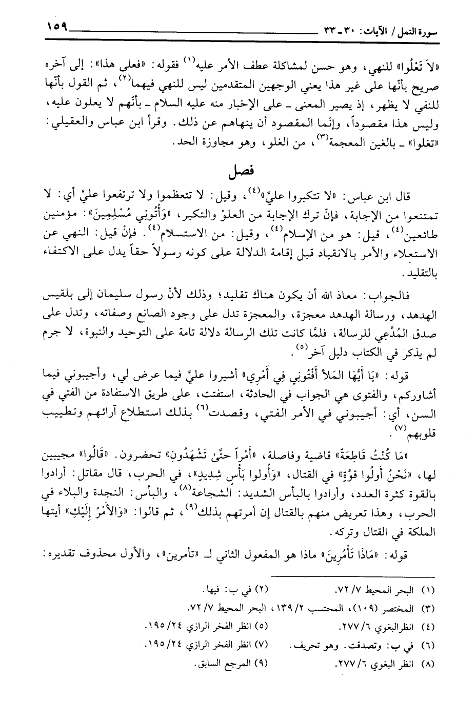 قال ابن عباس: «لا تتكبروا عليَّ» ، وقيل: لا تتعظموا ولا ترتفعوا عليَّ أي: لا تمتنعوا من الإجابة، فإنّ ترك الإجابة من العلوّ والتكبر، «وَأْتُونِي مُسْلِمِينَ» : مؤمنين طائعين، قيل: هو من الإسلام، وقيل: من الاستسلام. فإنْ قيل: النهي عن الاستعلاء والأمر بالانقياد قبل إقامة الدلالة على كونه رسولاً حقاً يدل على الاكتفاء بالتقليد.