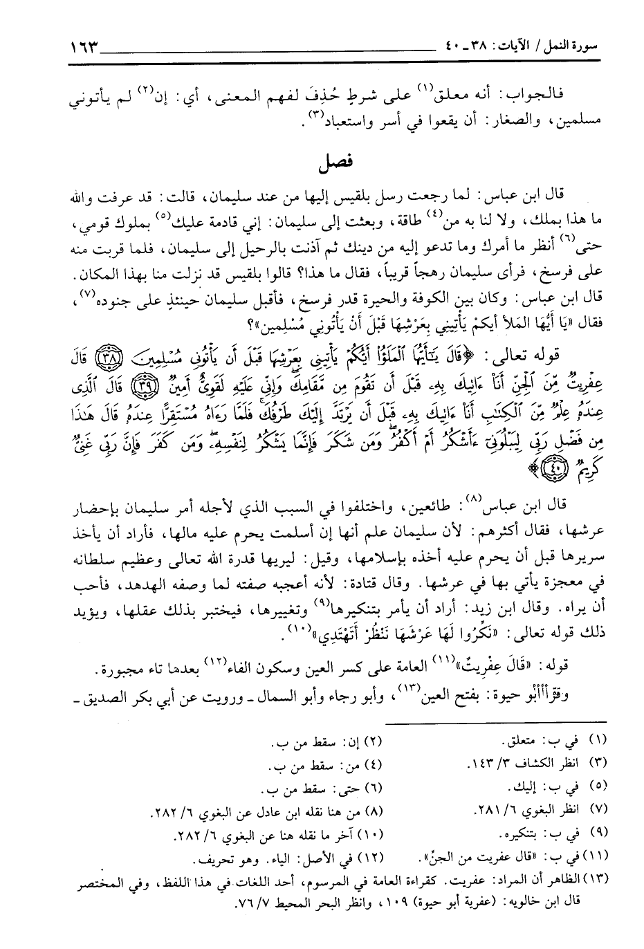 قال ابن عباس: لما رجعت رسل بلقيس إليها من عند سليمان، قالت: قد عرفت والله ما هذا بملك، ولا لنا به من طاقة، وبعثت إلى سليمان: إني قادمة عليك بملوك قومي، حتى أنظر ما أمرك وما تدعو إليه من دينك ثم آذنت بالرحيل إلى سليمان، فلما قربت منه على فرسخ، قرأى سليما رهجاً قريباً، فقال ما هذا؟ قالوا بلقيس قد نزلت منا بهذا المكان. قال ابن عباس: وكان بن الكوفة والحيرة قدر فرسخ، فأقبل سليمان حينئذٍ على جنوده، فقال: {قَالَ يا أيها الملأ أَيُّكُمْ يَأْتِينِي بِعَرْشِهَا قَبْلَ أَن يَأْتُونِي مُسْلِمِينَ} ؟ .