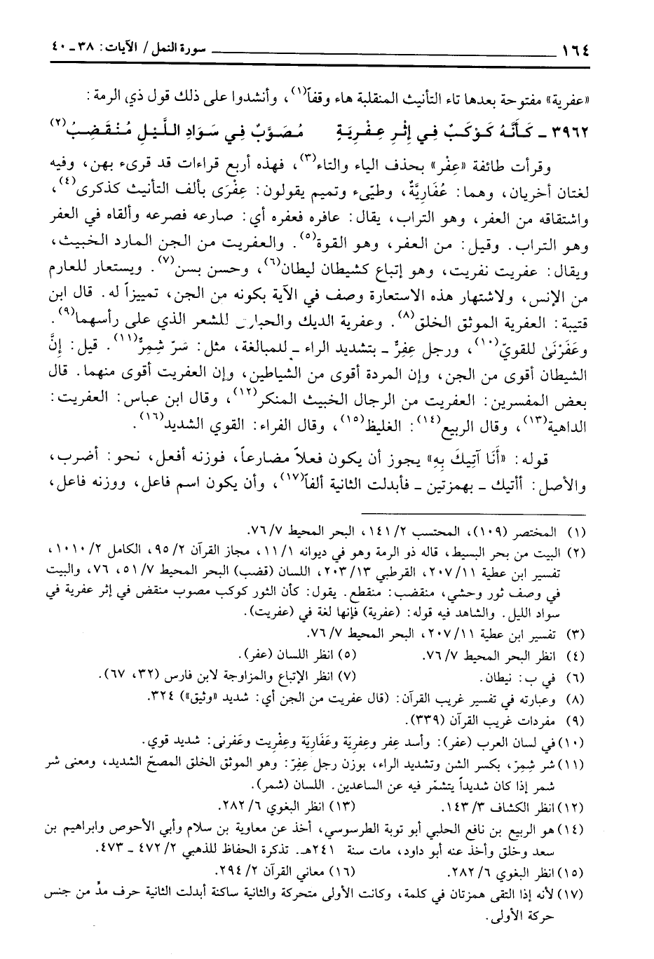 قرأت اطائفة «عِفْر» بحذف الياء والتاء، فهذه أربع قراءات قد قرىء بهن، وفيه لغتان أخريان، وهما: عُفَارِيَّةٌ، وطيّىء وتميم يقولون: عِفْرَى بألف التأنيث كذكرى، واشتقاقه من العفر، وهو التراب، يقال: عافره فعفره أي: صارعه فصرعه وألقاء في العفر وهو التراب. وقيل: من العفر، وهو القوة. والعفريت من الجن المارد الخبيث، ويقال: عفريت نفريت، وهو إتباع كشيطان ليطان، وحسن بسن. ويستعار للعارم من الإنس، ولاشتهار هذه الاستعارة وصف في الآية بكونه من الجن، تمييزاً له. قال ابن قتيبة: العفرية الموثق الخلق. وعفرية الديك والحبارى للشعر الذي على رأسهما. وعَفَرْنَى للقويّ، ورجل عِفِرٌّ - بتشديد الراء - للمبالغة، مثل: شرّ شِمرٌّ. قيل: إِنَّ الشيطان أقوى من الجن، وإن المردة أقوى من الشياطين، وإن العفريت أقوى منهما. قال بعض المفسرين: العفريت من الرجال الخبيث المنكر، وقال ابن عباس: العفريت، الداهية، وقال الربيع: الغليظ، وقال الفراء: القوي الشديد.