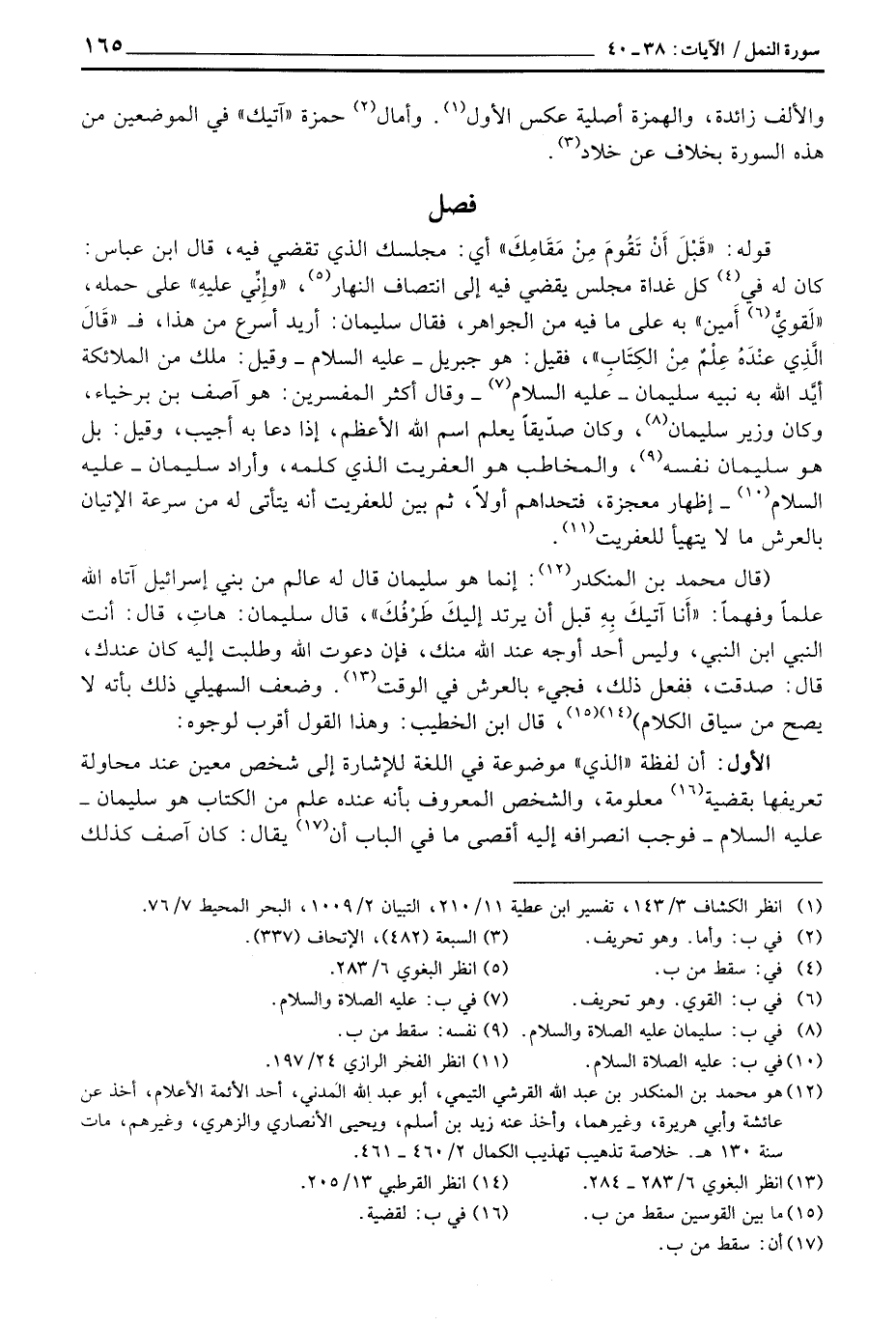 (قال محمد بن المنكدر: إنما هو سليمان قال له عالم من بني إسرائيل آتاه الله علماً وفهماً: {أَنَاْ آتِيكَ بِهِ قَبْلَ أَن يَرْتَدَّ إِلَيْكَ طَرْفُكَ} ، قال سليمان: هاتِ، قال: أنت النبي ابن النبي، وليس أحد أوجه عند الله منك، فإن دعوت الله وطلبت إليه كان عندك، قال: صدقت، ففعل ذلك، فجيء بالعرش في الوقت. وضعف السهيلي ذلك بأنه لا يصح من سياق الكلام) ، قال ابن الخطيب: وهذا القول أقرب لوجوه: