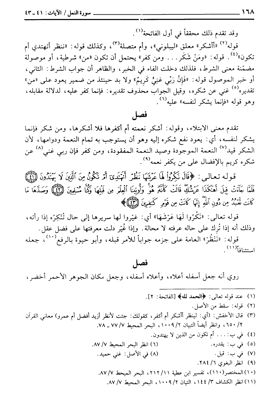 قوله «أأشكر» معلق «ليبلوني» ، وأم متصلة، وكذلك قوله: {نَنظُرْ أتهتدي أَمْ تَكُونُ} [النمل: 41] . قوله: {ومَنْ شَكَر ... ومن كفر} يحتمل أن تكون «من» شرطية، أو موصولة مضمّنة معنى الشرط، فلذلك دخلت الفاء في الخبر، والظاهر أن جواب الشرط: الثاني: أو خبر الموصول قوله: {فَإِنَّ رَبِّي غَنِيٌّ كَرِيمٌ} ولا بد حينئذ من ضمير يعود على «من» تقديره غني عن شكره، وقيل الجواب محذوف تقديره: فإنما كفر عليه، لدلالة مقابله، وهو قوله {فَإِنَّمَا يَشْكُرُ لِنَفْسِهِ} عليه.