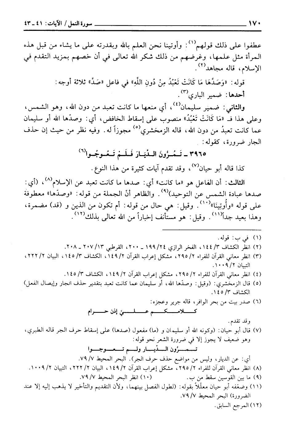 الثالثك أن الفاعل هو «ما كانت» أي: صدها ما كانت تعبد عن الإسلام، (أي: صدها عبادة الشمس عن التوحيد) . والظاهر أنّ الجملة من قوله: «وصدّها» معطوفة على قوله «وأُوتِينَا» . وقيل: هي حال من قوله: أم تكون من الذين و (قد) مضمرة، وهذا بعيد جداً. وقيل: هو مستأنف إخباراً من الله تعالى بذلك.