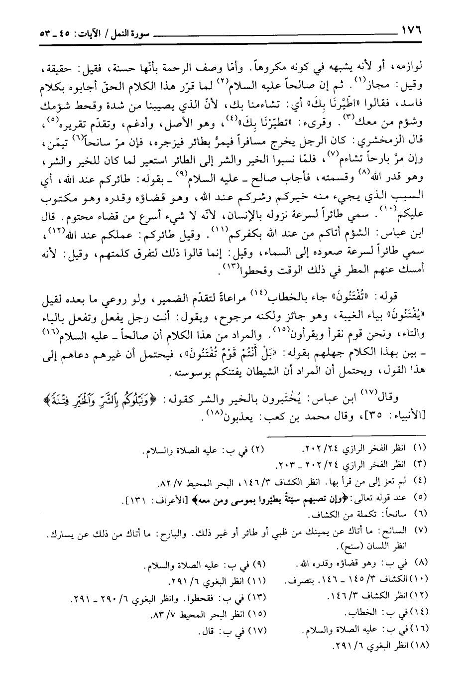 لوازمه، أو لأنه يشبهه في كونه مكروهاً، وأمّا وصف الرحمة بأنّها حسنة، فقيل: حقيقة، وقيل: مجاز. ثم إن صالحاً عليه السلام لما قرّر هذا الكلام الحقّ أجابوه بكلام فاسد، فقالوا «اطّيَّرنَا بِكَ» أي: تشاءمنا بك، لأنّ الذي يصيبنا من شدة وقحط شؤمك وشؤم من معك. وقرىء: «تطيّرنّا بِكَ» ، وهو الأصل، وأدغم، وتقدّم تقريره، قال الزمخشري: كان الرجل يخرج مسافراً فيمرُّ بطائر فيزجره، فإن مرّ سانحاً تيمّن، وإن مرَّ بارحاً تشاءم، فلمّا نسبوا الخير والشر إلى الطائر استعير لما كان للخير والشر، وهو قدر الله وقسمته، فأجاب صالح - عليه السلام - بقوله: طائركم عند الله، أي السبب الذي يجيء منه خيركم وشركم عند الله، وهو قضاؤه وقدره وهو مكتوب عليكم. سمي طائراً لسرعة نزوله بالإنسان، لأنّه لا شيء أسرع من قضاء محتوم. قال ابن عباس: الشؤم أتاكم من عند الله بكفركم. وقيل طائركم: عملكم عند الله، سمى طائراً لسرعة صعوده إلى السماء، وقيل: إنما قالوا ذلك لتفرق كلمتهم، وقيل: لأنه أمسك عنهم المطر في ذلك الوقت وقطحوا.