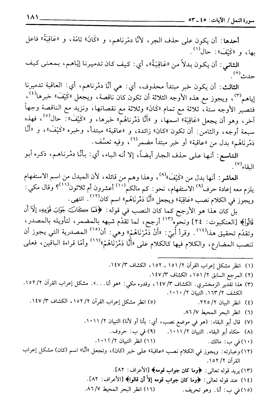 الثالثك أن يكون خبر مبتدأ محذوف، أي: هي أنَّا دمَّرناهم، أي: العاقبة تدميرنا إياهم، ويجوز مع هذه الأوجه الثلاثة أن تكون كان ناقصة، ويجعل «كَيْفَ» خبرها، فتصير الأوجه ستة، ثلاثة مع تمام «كَانَ» وثلاثة مع نقصانها، ونزيد مع الناقصة وجهاً آخر، وهو ان يجعل «عَاقِبَة» اسمها، و «أَنَّا دَمَّرناهُم» خبرها، و «كَيْفَ» : حال، فهذه سبعة أوجه، والثامن: أن تكون «كان» زائدة، و «عاقبة» مبتدأ، وخبره «كَيْفَ» ، و «أَنَّا دَمَّرنَاهُم» بدل من «عاقبة» أو خبر مبتدأ مضمر، وفيه تعسُّف.