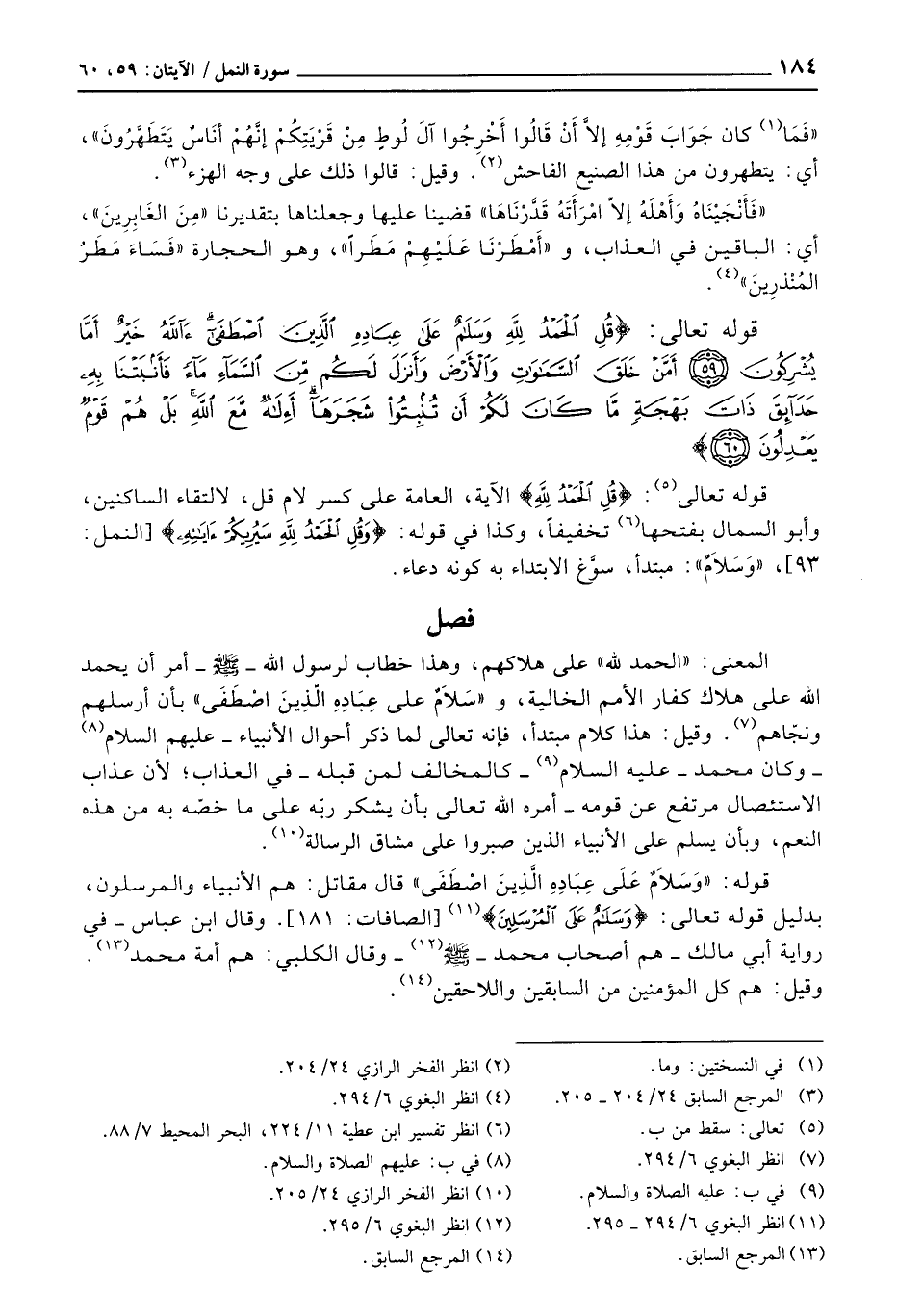 قوله تعالى: {قُلِ الحمد لِلَّهِ} الآية، العامة على كسر لام قل، لالتقاء الساكنين، وأبو السمال بفتحها تخفيفاً، وكذا في قوله: {وَقُلِ الحمد للَّهِ سَيُرِيكُمْ آيَاتِهِ} [النمل: 93] ، «وَسَلاَمٌ» : مبتدأ، سوَّغ الابتداء به كونه دعاء.