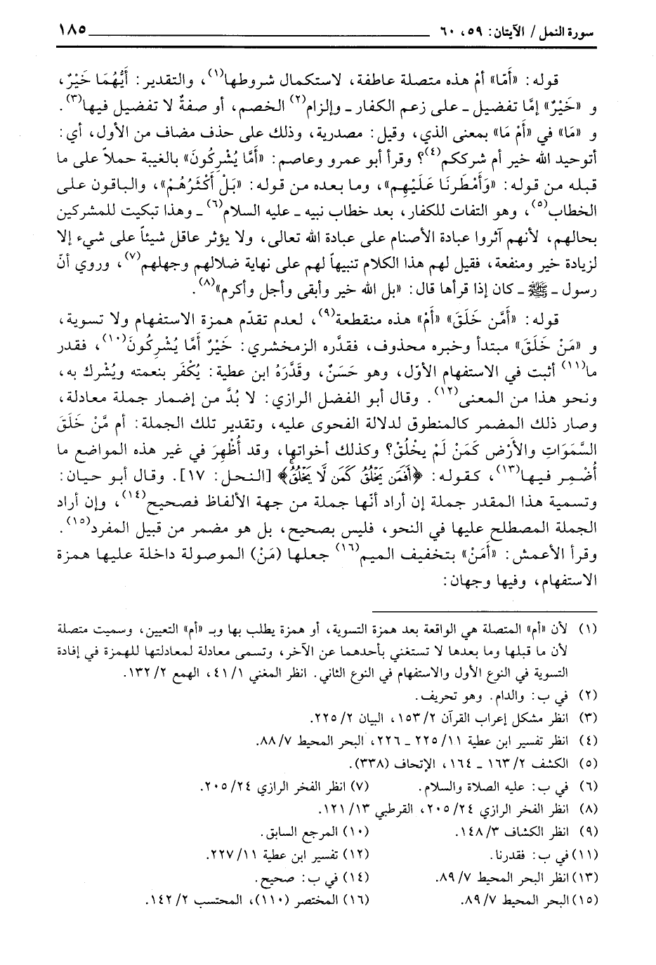 قوله: «أَمَّن خَلَقَ» «أَمْ» هذه منقطعة، لعدم تقدّم همزة الاستفهام ولا تسوية، و «مَنْ خَلَقَ» مبتدأ وخبره محذوف، فقدَّره الزمخشري: خَيْرٌ أَمَّا يُشْرِكُونَ، فقدر ما أثبت في الاستفهام الأوّل، وهو حَسَنٌ، وقَدَّرَهُ ابن عطية: يُكفَر بنعمته ويُشْرك به، ونحو هذا من المعنى. وقال أبو الفضل الرازي: لا بُدَّ من إضمار جملة معادلة، وصار ذلك المضمر كالمنطوق لدلالة الفحوى عليه، وتقدير تلك الجملة: أم مَّنْ خَلَقَ السَّمَواتِ والأَرْض كَمَنْ لَمْ يَخْلُقُ؟ وكذلك أخواتها، وقد أُظْهِرَ في غير هذا المواضع ما أُضْمِر فيها، كقوله: