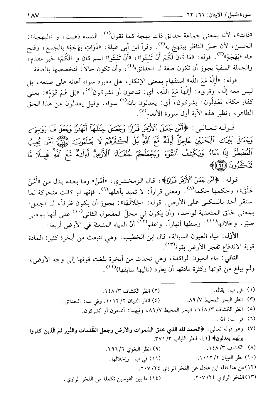 قوله: {أَمَّن جَعَلَ الأرض قَرَاراً} ، قال الزمخشري: «أَمَّنْ» وما بعده بدل من «أَمَّنْ خَلَقَ» ، وحكمها حكمه. ومعنى قراراً: لا تميد بأهلها، فإنها لو كانت متحركة لما استقر أحد بالسكنى على الأرض. قوله: «خِلاَلَهَا» : يجوز أن يكون ظرفاً، ل «جعل» بمعنى خلق المتعدية لواحد، وأن يكون في محلّ المفعول الثاني على أنها بمعنى صيّر، وخلالها: وسطها أنهاراً. واعلم أنّ المياه المنبعثة في الأرض أربعة.