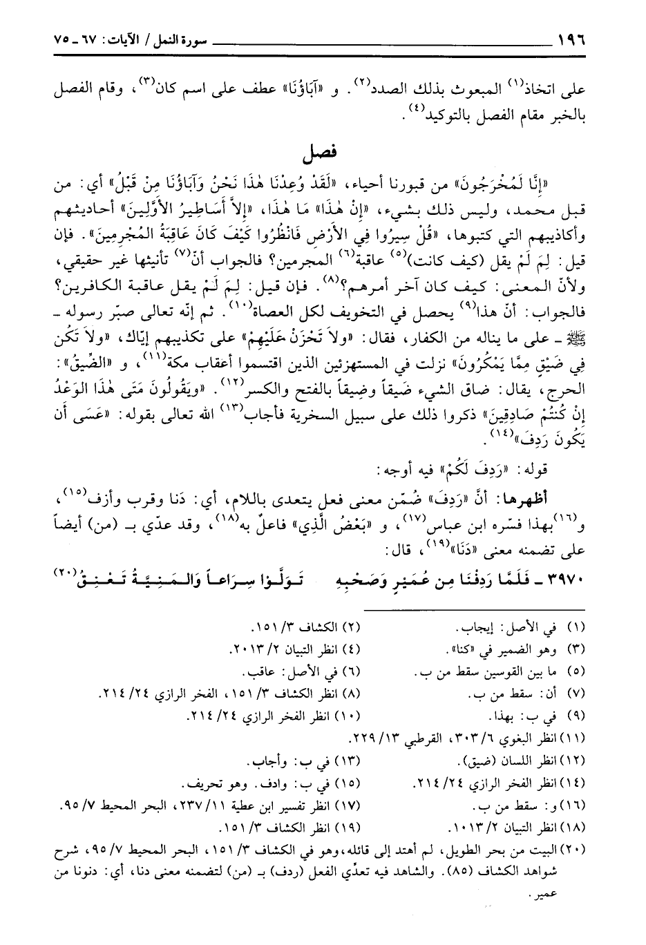 «إِنَّا لَمُخْرَجُونَ» من قبورنا أحيا، {لَقَدْ وُعِدْنَا هذا نَحْنُ وَآبَآؤُنَا مِن قَبْلُ} أي: من قبل محمد: وليس ذلك بشيء، «إِنْ هذَا» ما هذَا، {إِلاَّ أَسَاطِيرُ الأولين} أحاديثهم وأكاذيبهم التي كتبوها، {فَاْنظُرُواْ كَيْفَ كَانَ عَاقِبَةُ المجرمين} . فإن قيل: لِمَ لَمْ يقل (كيف كانت) عاقبة المجرمين؟ فالجواب أنّ تأنيثها غير حقيقي، ولأنّ المعنى: كيف كان آخر أمرهم؟ . فإن قيل: لِمَ لَمْ يقل عاقبة الكافرين؟ فالجواب: أنّ هذا يحصل في التخويف لكل العصاة. ثم إنّه تعالى صبّر رسوله - صَلَّى اللَّهُ عَلَيْهِ وَسَلَّم َ - على ما يناله من الكفار، فقال: {وَلاَ تَحْزَنْ عَلَيْهِمْ} على تكذيبهم إيّاك، {وَلاَ تَكُن فِي ضَيْقٍ مِّمَّا يَمْكُرُونَ} نزلت في المستهزئين الذين اقتسموا أعقاب مكة، و «الضِّيقُ» : الحرج، يقال: ضاق الشيء ضَيقاً وضِيقاً بالفتح والكسر. {وَيَقُولُونَ متى هذا الوعد إِن كُنتُمْ صَادِقِينَ} ذكروا ذلك على سبيل السخرية فأجاب الله تعالى بقوله: {عسى أَن يَكُونَ رَدِفَ} .