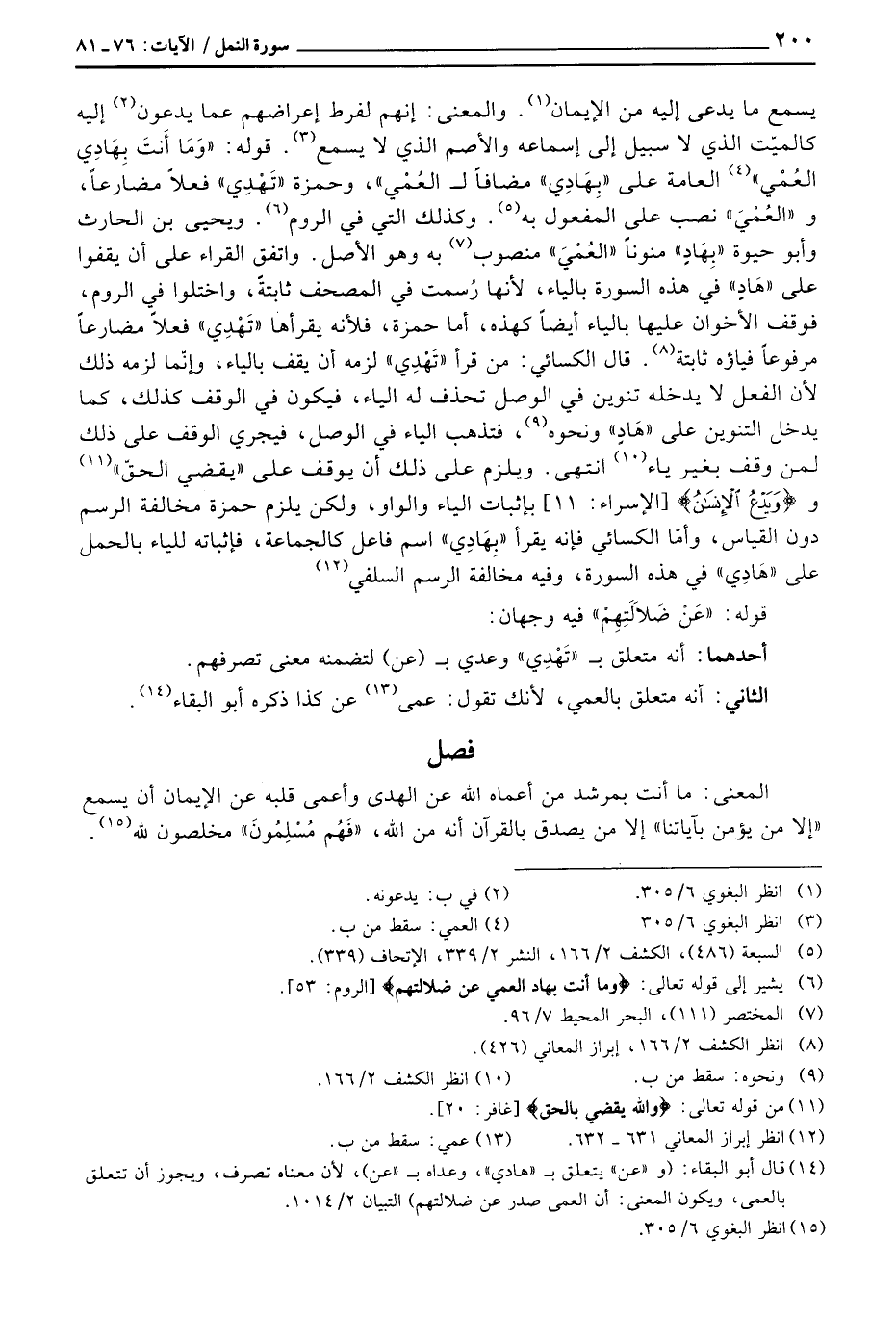 يسمع ما يدعى إليه من الإيمان. والمعنى: إنهم لفرط إعراضهم عما يدعون إليه كالميّت الذي لا سبيل إلا إسماعه والأصم الذي لا يسمع. قوله: {وَمَآ أَنتَ بِهَادِي العمي} العامة على «بِهَادِي» مضافاً ل «العُمْي» ، وحمزة «تَهْدِي» فعلاً مضارعاً و «العُمْيَ» نصب على المفعول به. وكذلك التي في الروم. ويحيى بن الحارث وأبو حيوة «بِهَادِ» منوناً «العُمْيَى» منصوب به وهو الأصل. واتفق القراء على أن يقفوا على «هَادٍ» في هذه السورة بالياء، لأنها رُسمت في المصحف ثابتةً، واختلفوا في الروم، فوقف الأخوان عليها بالياء أيضاً كهذه، أما حمزة، فلأنه يقرأها «تَهْدِي» فعلاً مضارعاً مرفوعاً فياؤه ثابتة. قال الكسائي: من قرأ «تَهْدِي» لزمه أن يقف بالياء، وإنّما لزمه ذلك لأن الفعل لا يدخله تنوين في الوصل تحذف له الياء، فيكون في الوقف كذلك، كما يدخل التنوين على «هَادٍ» ونحوه، فتذهب الياء في الوصل، فيجري الوقف على ذلك لمن وقف بغير ياء انتهى. ويلزم على ذلك أن يوقف على «يقضي الحقّ» و {وَيَدْعُ الإنسان} [الإسراء: 11] بإثبات الياء والواو، ولكن يلزم حمزة مخالفة الرسم دون القياس، وأمّا الكسائي فإنه يقرأ «بِهَادِي» اسم فاعل كالجماعة، فإثباته للياء بالحمل على «هَادِي» في هذه السورة، وفيه مخالفة الرسم السلفي.