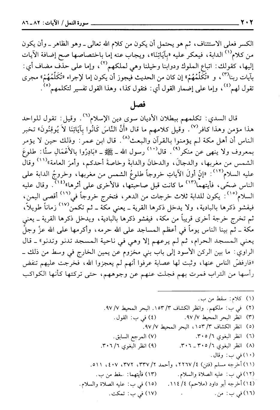 الكسر فعلى الاستئناف، ثم هو يحتمل أن يكون من كلام الله تعالى - وهو الظاهر - وأن يكون من كلام الدابة، فيعكر عليه «بِآيَاتِنَا» ويجاب عنه إما باختصاصها صح إضافة الآيات إليها، كقولك: اتباع الملوك ودوابنا وخيلنا وهي لملكهم، وإما على حذف مضاف أي: بآيات ربنا، و «تُكَلِّمُهُمْ» إن كان من الحديث فيجوز أن يكون إما لإجراء «تُكَلِّمُهُمْ» مجرى تقول لهم، وإما على إضمار القول أي: فتقول كذا، وهذا القول تفسير لتكلمهم.
