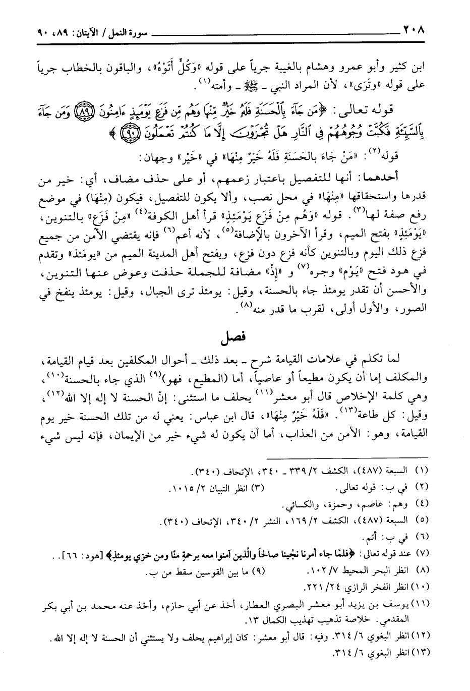 لما تكلم في علامات القيامة شرح - بعد ذلك - أحوال المكلفين بعد قيام القيامة والمكلف إما أن يكوم مطيعاً أو عاصيا، أما (المطيع، فهو) الذي جاء بالحسنة وهي كلمة الإخلاص قال أبو معشر يحلف ما ساتثنى: إنّ الحسنة لا إله إلا الله وقيل: كل طاعة. {فَلَهُ خَيْرٌ مِنْهَا} ، قال ابن عباس: يعني له من تلك الحسنة خير يوم القيامة، وهو: الأمن من العذاب، أما أن يكون له شيء خير من الإيمان، فإنه ليس شيء