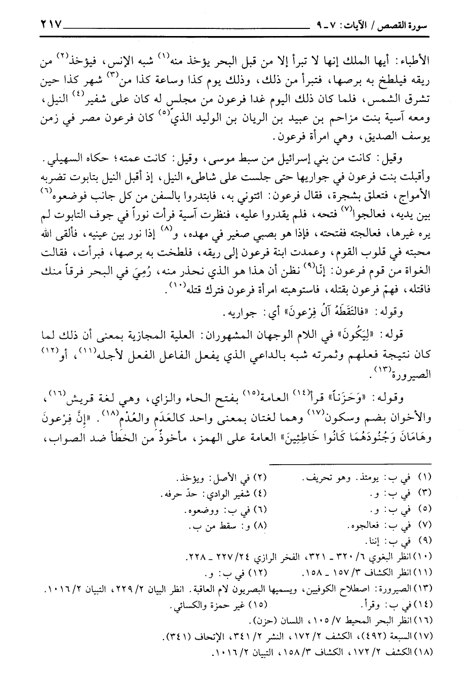 قووله: «وَحَزَناً» قرأ العامة بفتح الحاء والزاي، وهي لغة قريش، والأخوان بضم وسكون وهما لغتان بمعنى واحد كالعَدَمَ والعُدْمِ: {إِنَّ فِرْعَوْنَ وَهَامَانَ وَجُنُودَهُمَا كَانُواْ خَاطِئِينَ} العامة على الهمز، مأخوذٌ من الخطأ ضد الصواب،