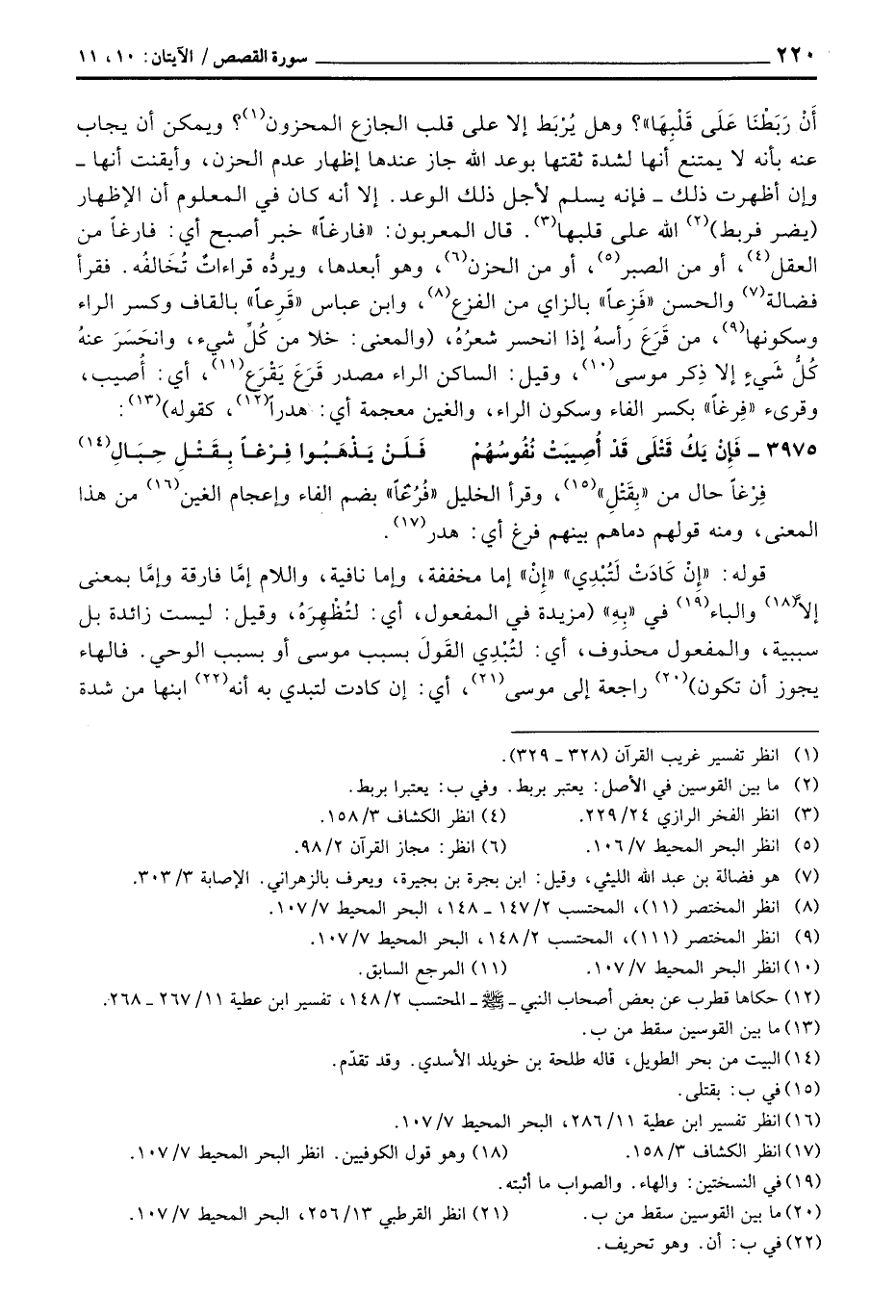 أَن رَّبَطْنَا على قَلْبِهَا} ؟ وهل يُرْبَط إلا على قلب الجازع المحزون؟ ويمكن أن يجاب عنه بأنه لا يمتنع أنها لشدة ثقتها بوعد الله جاز عندها إظهار عدم الحزن، وأيقنت إنها - وإن أظهرت ذلك - فإنه يسلم لأجل ذل الوعد. إلا أنه كان في المعلوم أن الإظهار (يضر فربط) الله على قلبها. قال المعربون: «فارغاً» خبر أصبح أي: فارغاً من العقل، أو من الصبر، أو من الحزن، وهو أبعدها، ويردُّه قراءاتٌ تُخَالفُه. فقرأ فضالة والحسن «فَزِعاً» بالزاي من الفزع، وابن عباس «قَرِعاً» بالقاف وكسر الراء وسكونها، من قَرَعَ رأسهُ إذا انحسر شعرُهُ، (والمعنى: خلا من كُلِّ شيء، وانحَسَرَ عنهُ كُلُّ شَيءٍ إلا ذِكر موسى، وقيل: الساكن الراء مصدر قَرَعَ يَقْرَع، أي: أُصيب، وقرىء «فِرغاً» بكسر الفاء وسكون الراء، والغين معجمة أي: هدراً، كقوله) :