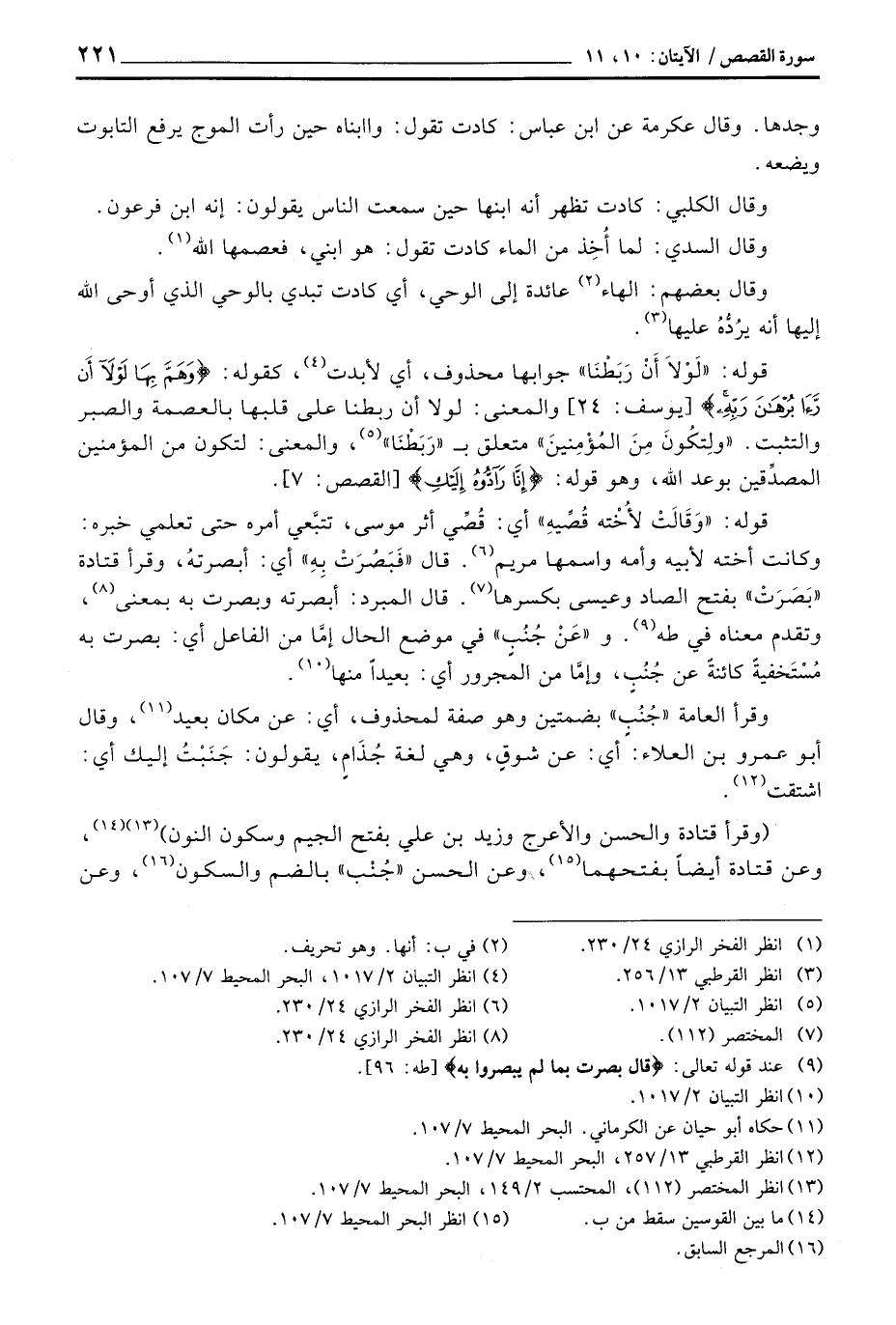 قوله: {وَقَالَتْ لأُخْتِهِ قُصِّيهِ} أي: قُصِّي أثر موسى، تتبَّعي أمره حتى تعلمي خبره: وكانت أخته لأبيه وأمه واسمها مريم. قال «فَبَصُرَتْ بِهِ» أي: أبصرتهُ، وقرأ قتادة «بَصَرَتْ» بفتح الصاد وعيسى بكسرها. قال المبرد: أبصرته وبصرت به بمعنى، وتقدم معناه في طه. و «عَنْ جُنُبٍ» في موضع الحال إمَّا من الفاعل أي: بصرت به مُسْتَخفيةً كائنةً عن جُنُبٍ، وإمَّا من المجرور أي: بعيداً منها.