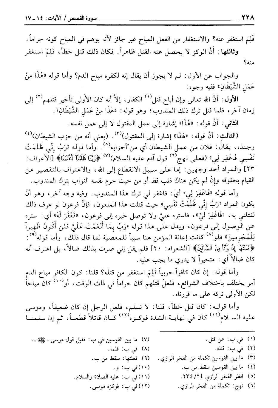 وأما قوله «فَاغْفِرْ لِي» أي: فاغفر لي ترك هذا المندوب. وفيه وجه آخر، وهو أن يكون المراد {قَالَ رَبِّ إِنِّي ظَلَمْتُ نَفْسِي} حيث قتلت هذا الملعون، فإنَّ فرعون لو عرف ذلك لقتلني به، «فَاغْفِرْ ليْ» ، فاستره عليَّ ولا توصل خبره إلى فرعون، «فَغَفَرَ لَهُ» أي: ستره عن الوصول إلى فرعون، ويدل على هذا قوله {رَبِّ بِمَآ أَنْعَمْتَ عَلَيَّ فَلَنْ أَكُونَ ظَهِيراً لِّلْمُجْرِمِينَ} فلو كانت إعانة المؤمن هنا سبباً للمعصية لما قال ذلك، وأما قوله {فَعَلْتُهَآ إِذاً وَأَنَاْ مِنَ الضالين} [الشعراء: 20] فلم يقل إني صرت بذلك ضالاً، بل اعترف أنه كان ضالاً أي: متحيراً لا يدري ما يجب عليه.