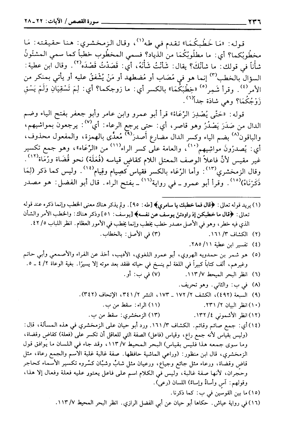 قوله: {حتى يُصْدِرَ الرعآء} قرأ أبو عمرو وابن عامر وأبو جعفر بفتح الياء وضم الدال من صَدَرَ يَصْدُرُ وهو قاصر، أي: حتى يرجع الرعاء: أي: يرجعون بمواشيهم والباقون بضم الياء وكسر الدال مضارع أَصدرَ مُعدًّى بالهمزة، والمفعول محذوف، أي: يُصدرُونَ مواشِيهم، والعامة على كسر الراء من «الرِّعَاء» ، وهو جمع تكسير غير مقيس لأنَّ فاعلاً الوصف المعتل اللام كقاضٍ قياسه (فُعَلَة) نحة قُضَاة ورُمَاة.