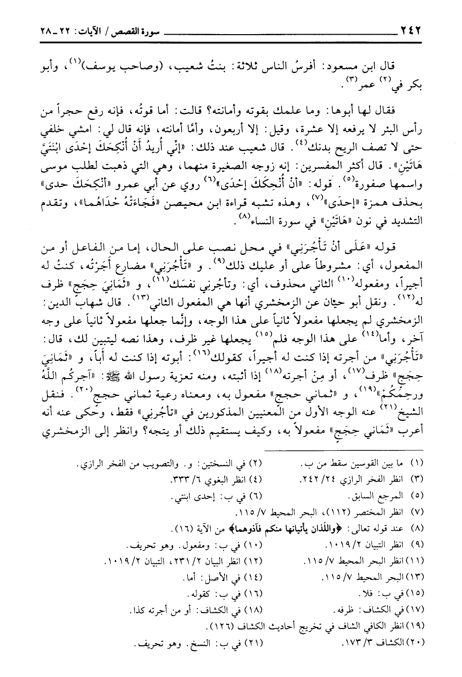 فقال لها أبوها: وما علمك بقوته وأمانته؟ قالت: أما قوتُه، فإنه رفع حجراً من رأس البئر لا يرفعه إلا عشرة، وقيل: إلا أربعون، وأمَّا أمانته، فإنه قال لي: امشي خلفي حتى لا تصف الريح بدنك. قال شعيب عند ذلك: {إني أُرِيدُ أَنْ أُنكِحَكَ إِحْدَى ابنتي هَاتَيْنِ} . قال أكثر المفسرين: إنه زوجه الصغير منهما، وهي التي ذهبت لطلب موسى واسمها صفورة. قوله: {أَنْ أُنكِحَكَ إِحْدَى} روي عن أبي عمرو «أنْكِحَكَ حدى» بحذف همزة «إحدَى» ، وهذه تشبه قراءة ابن محيصن «فَجَاءَتْهُ حْدَاهُما» ، وتقدم التشديد في نون «هَاتَيْنِ» في سورة النساء.