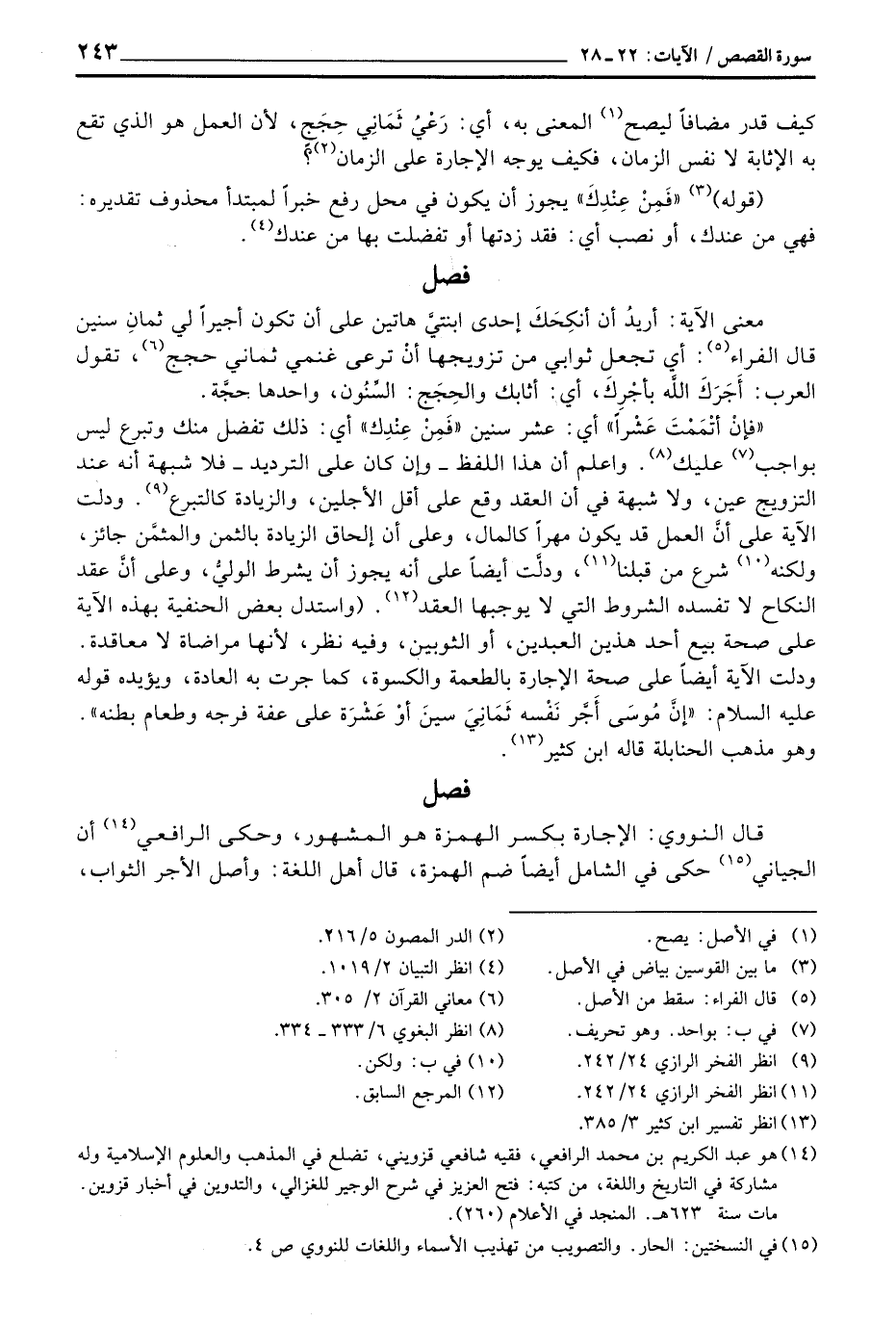 {فَإِنْ أَتْمَمْتَ عَشْراً} أي: عشر سنين «فَمِنْ عِنْدِك» أي: ذلك تفضل منك وتبرع ليس بواجب عليك. واعلم أن هذا اللفظ - وإن كان على الترديد - فلا شبهة أنه عند التزيوج عين، ولا شبهة في أن العقد وقع على أقل الأجلين، والزيادة كالتبرع. ودلت الآيية على أنَّ العمل قد يكون مهراً كالمال، وعلى أن إلحاق الزيادة بالثمن والمثمَّن جائز، ولكنه شرع من قبلنا، ودلَّت أيضاً على أنه يجوز أن يشرط الوليُّ، وعلى أنَّ عقد النكاح لا تفسده الشروط التي لا يوجبها العقد. (واستدل بعض الحنفية بهذه الآية على صحة بيع أحد هذين العبدين، أو الثوبين، وفيه نظر، لأأنها مراضاة لا معاقدة. ودلت الآية أيضاً على صحة الإجارة بالطعمة والكسوة، كما جرت به العادة، ويؤيده قوله عليه السلام: «إنَّ مُوسَى أَجَّر نَفْسه ثَمَانِيَ سينَ أوْ عَشْرَة على عفة فرجه وطعام بطنه» وهو مذهب الحنابلة قاله ابن كثير.