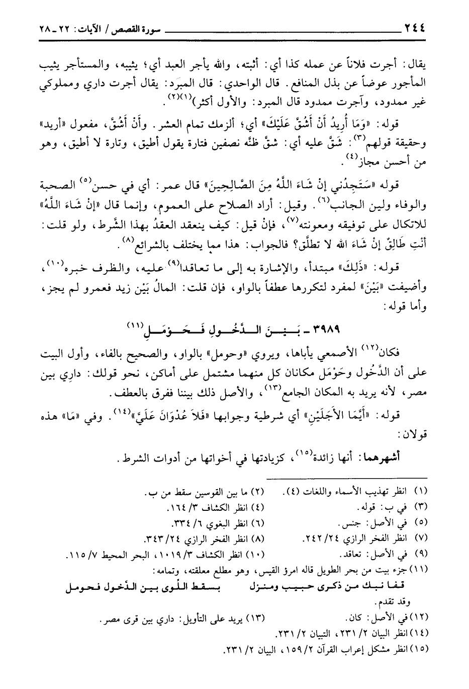 3989 - بَيْنَ الدَّخُولِ فَحَوْمَلِ ... فكان الأصمعي يأباها، ويوري «وحوامل» بالواو، والصحيح بالفاء، وول البيت على أن الدَّخُول وحَوْمَل مكانان كل منهما مشتمل على أماكن، نحو قولك: دارِي بين مصر، لأنه يريد به المكان الجامع، والأصل ذلك بيننا ففرق بالعطف.