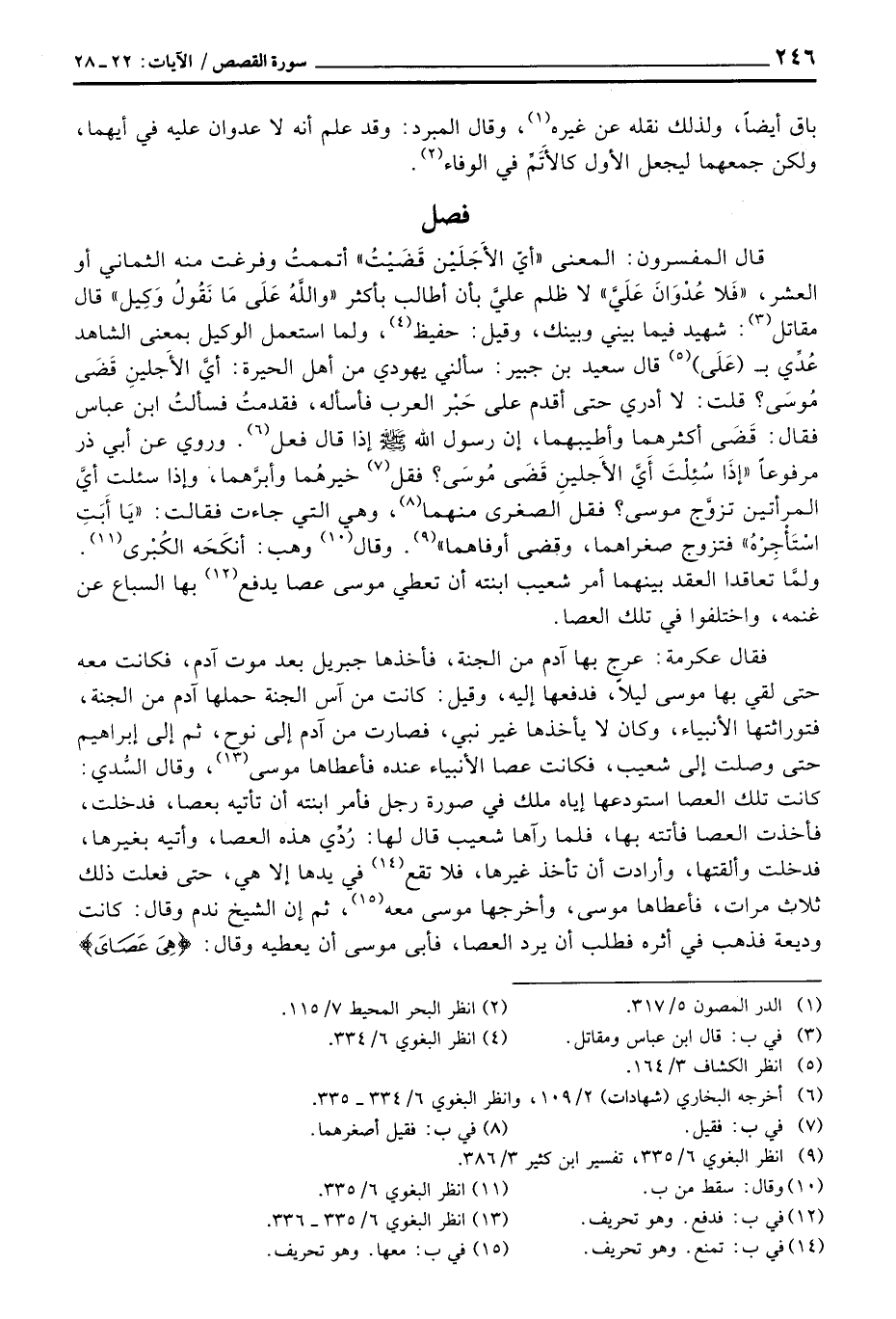 قال المفسرون: المعنى «أيّ الأَجَلَيْن قَضَيْتُ» أتممتُ وفرغت منه الثماني أو العشر، {فَلاَ عُدْوَانَ عَلَيَّ} لا ظلم عليَّ بأن أطالب بأكثر {والله على مَا نَقُولُ وَكِيلٌ} قال مقاتل: شهيد فيما بيني وبينك، وقيل: حفيظ، ولما استعمل الوكيل بمعنى الشاهد عُدِّي ب (عَلَى) قال سعيد بن جبير: سألني يهودي من أهل الحيرة: أيَّ الأَجلينِ قَضَى مُوسَى؟ قلت: لا أدري حتى أقدم على حَبْر العرب فأسأله، فقدمتُ فسألتُ ابن عباس فقال: قَضَى أكثرها وأطيبهما، إن رسول الله صَلَّى اللَّهُ عَلَيْهِ وَسَلَّم َ إذا قال فعل.