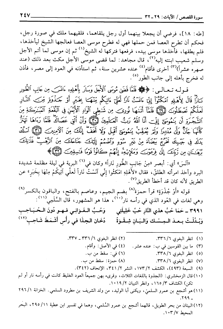 طه: 18] ، فرضي أن يجعلا بينهما أول رجل يلقاهما، فلقيهما ملك في صورة رجل، فحكم أن تطرح العصا فمن حملها فهي له فطرح موسى العصا فعالجها الشيخ ليأخذها، فلم يطقها، فأخذها موسى بيده، فرعفها فتركها له الشيخ ثم إن موسى لم أتم الأجل وسلم شعيب ابنته إليه، قال مجاهد: لما قضى موسى الأجل مكث بعد ذلك (عند صهره عشراً) أخرى فأقام عنده عشرين سنة، ثم استأذنه في العود إلى مصر، فأذن له فخرج بأهله إلى جانب الطور.