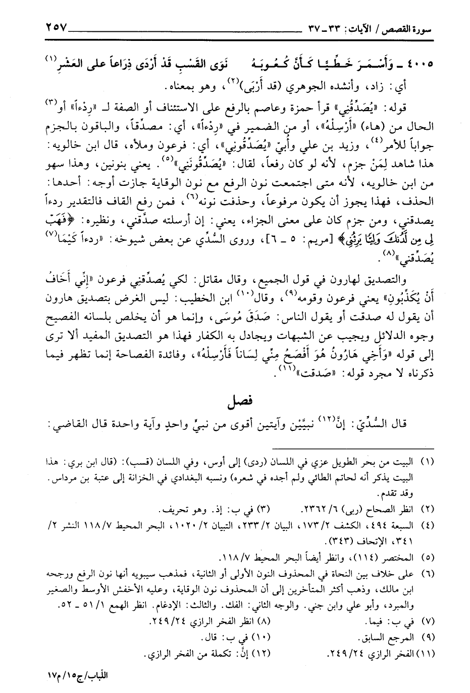 قوله: «يُصَدِّقُنِي» قرأ حمزة وعاصم بالرفع على الاستئناف أو الصفة ل «رِدْءاً» أو الحال من (هاء) «أَرْسِلْهُ» ، أو من الضمير في «رِدْءاً» ، أي: مصدِّقاً، والباقون بالجزم جواباً للأمر، وزيد بن علي وأُبيّ «يُصَدِّقُونِي» ، أي: فرعون وملأه، قال ابن خالويه: هذا شاهد لِمَنْ جزم، لأنه لو كان رفعاً، لقال: «يُصَدِّقُونَنِي» . يعني بنونين، وهذا سهو من ابن خالويه، لأنه متى اجتمعت نون الرفع مع نون الوقاية جازت أوجه: أحدها: الحذف، فهذا يجوز أن يكون مرفوعاً، وحذفت نونه، فمن رفع القاف فالتقدير ردءاً يصدقين، ومن جزم كان على معنى الجزاء، يعني: إن أرسلته صدَّقني، ونظيره: {فَهَبْ لِي مِن لَّدُنْكَ وَلِيّاً يَرِثُنِي} [مريم: 5 - 6] ، وروى السُّدِّي عن بعض شيوخه: {رداءاً كَيْمَا يُصَدِّقني} .