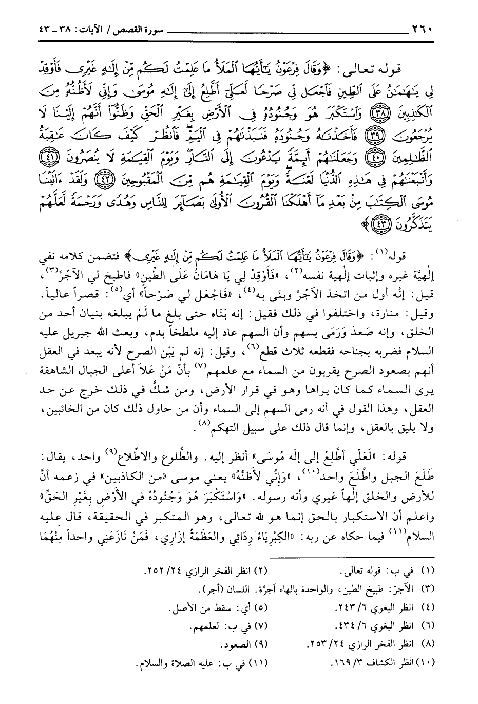 قوله: {وَقَالَ فِرْعَوْنُ يا أيها الملأ مَا عَلِمْتُ لَكُمْ مِّنْ إله غَيْرِي} فتضمن كلامه نفي إلهيَّة غيره وإثبات إلهية نفسه، {فَأَوْقِدْ لِي ياهامان عَلَى الطين} فاطبخ لي الآجُرَّ، قيل: إنَّه أول من اتخذ الآجُرَّ وبنَى به، {فاجعل لِّي صَرْحاً} أي: قصراً عالياً. وقيل: منارة، واختلفوا في ذلك فقيل: إنه بَنَاه حتى بلغ ما لَمْ يبلغه بنيان أحد من الخلق، وإنه صَعدَ وَرَمَى بسهم وأن السهم عاد إليه ملطخاً بدم، وبعث الله جبريل عليه السلام فضربه بجناحة فقطعه ثلاث قطع، وقيل: إنه لم يَبْن الصرح لأنه يبعد في العقل أنهم بصعود الصرح يقربون من السماء مع علمهم بأنّ مَنْ عَلاَ أعلى الجبال الشاهقة يرى السماء كما كان يراها وهو في قرار الأرض، ومن شكَّ في ذلك خرج عن حد العقل، وهذا القول في أنه رمى السهم إلى السماء وأن من حاول ذلك كان من الخائبين، ولا يليق بالعقل، وإنما قال ذلك على سبيل التهكم.