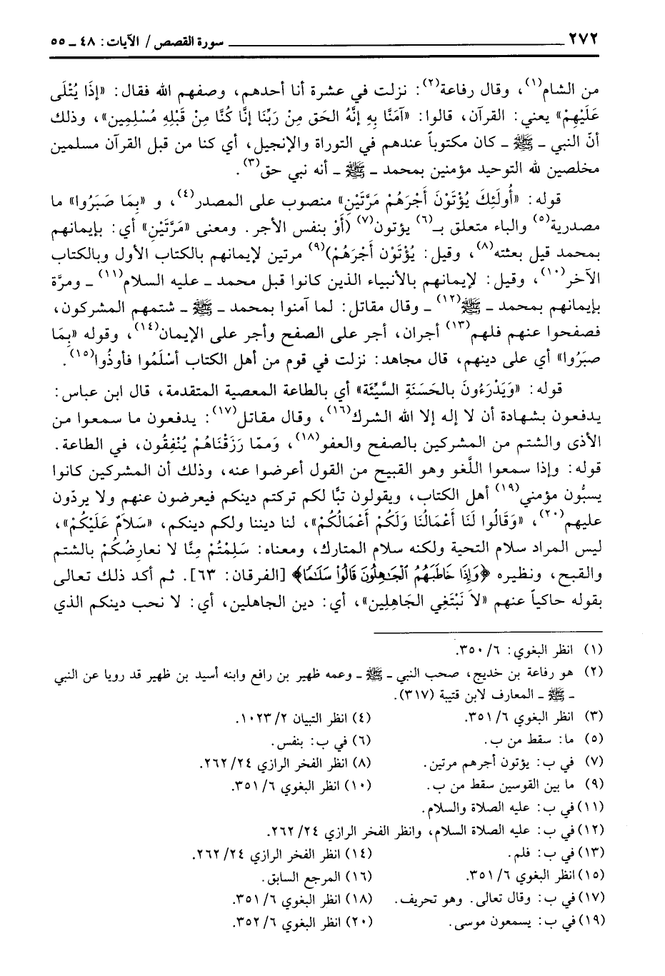 قوله: {وَيَدْرَؤُنَ بالحسنة السيئة} أي بالطاعة المعصية المتقدمة، قال ابن عباس: يدفعون بشهادة أن لا إله إلا الله الشرك، وقال مقاتل: يدفعون ما سمعوا من الأذى والشتم من المشركين بالصفح والعفو، وَممّا رَزَقْنَاهُمْ يُنْفِقُون، في الطاعة. قوله: وإذا سمعوا اللَّغو وهو القبيح من القول أعرضوا عنه، وذلك أن المشركين كانوا يسبُّون مؤمني أهل الكتاب، ويقولون تبّاً لكم تركتم دينكم فيعرضون عنهم ولا يردّون عليهم، {أُوْلَ ? ئِكَ يُؤْتُونَ أَجْرَهُم مَّرَّتَيْنِ بِمَا صَبَرُواْ وَيَدْرَؤُنَ بِ الْحَسَنَةِ السَّيِّئَةَ وَمِمَّا رَزَقْنَاهُمْ يُنفِقُونَ} , لنا ديننا ولكم دينكم، {سَلاَمٌ عَلَيْكُمْ} ، ليس المراد سلام التحية ولكنه سلام المتارك، ومعناه: سَلِمْتُمْ مِنَّا لا نعارِضُكُمْ بالشتم والقبح، ونظيره {وَإِذَا خَاطَبَهُمُ الجَاهِلُونَ قَالُواْ سَلاَماً} [الفرقان: 63] . ثم أكد ذلك تعالى بقوله حاكياً عنهم {لاَ نَبْتَغِي الجاهلين} ، أي: دين الجاهلين، أي: لا نحب دينكم الذي