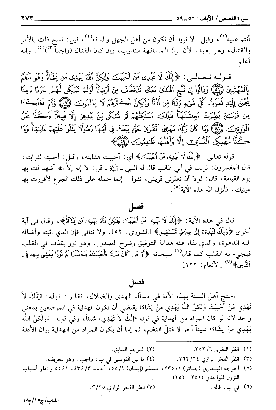 احتج أهل السنة بهذه الآية في مسألة الهدى والضلال، فقالوا: قوله: {إِنَّكَ لاَ تَهْدِي مَنْ أَحْبَبْتَ ولكن الله يَهْدِي مَن يَشَآءُ} يقتضي أن تكون الهداية في الموضعين بمعنى واحد لأنه لو كان المراد من الهداية في قوله {إنَّكَ لاَ تَهْدِي} شيئاً، وفي قوله: {ولكن الله يَهْدِي مَن يَشَآءُ} شيئاً آخر لاختلّ النظم، ثم إما أن يكون المراد من الهداية بيان الأدلة