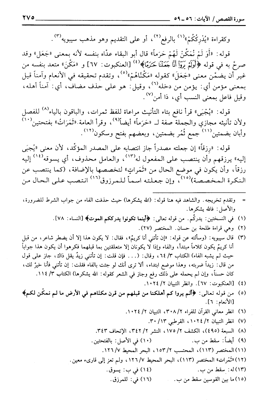 قوله: «رِزقاً» إن جعلته مصدراً جاز انتصابه على المصدر المؤكِّد، لأن معنى «يُجبَى إليه» يرزقهم وأن ينتصب على المفعول له، والعامل محذوف، أي يسوقه إليه رزقاً، وأن يكون في موضع الحال من «ثَمَراتٍ» لتخصصها بالإضافة، (كما ينتصب عن النكرة المخصصة) ، وإن جعلته اسماً للمرزوق انتصب على الحال من «