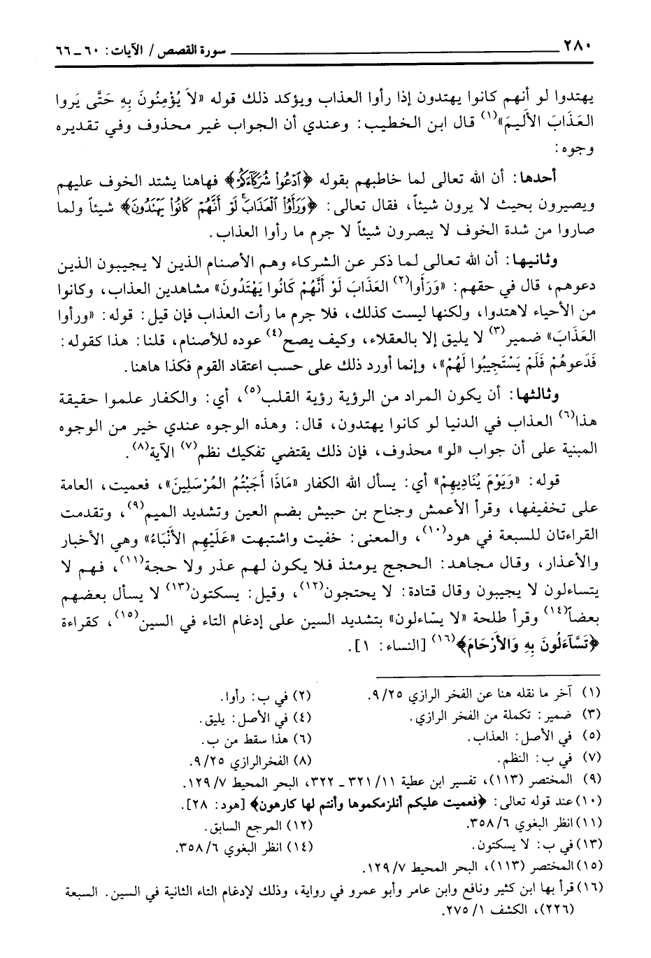 وثالثها: أن يكون المراد من الرؤية رؤية القلب، أي: والكفار علموا حقيقة هذا العذاب في الدنيا لو كانوا يهتدون، قال: وهذه الوجوه عندي خير من الوجوه المبنية على أن جواب «لو» محذوف، فإن ذلك يقتضي تفكيك نظم الآية.