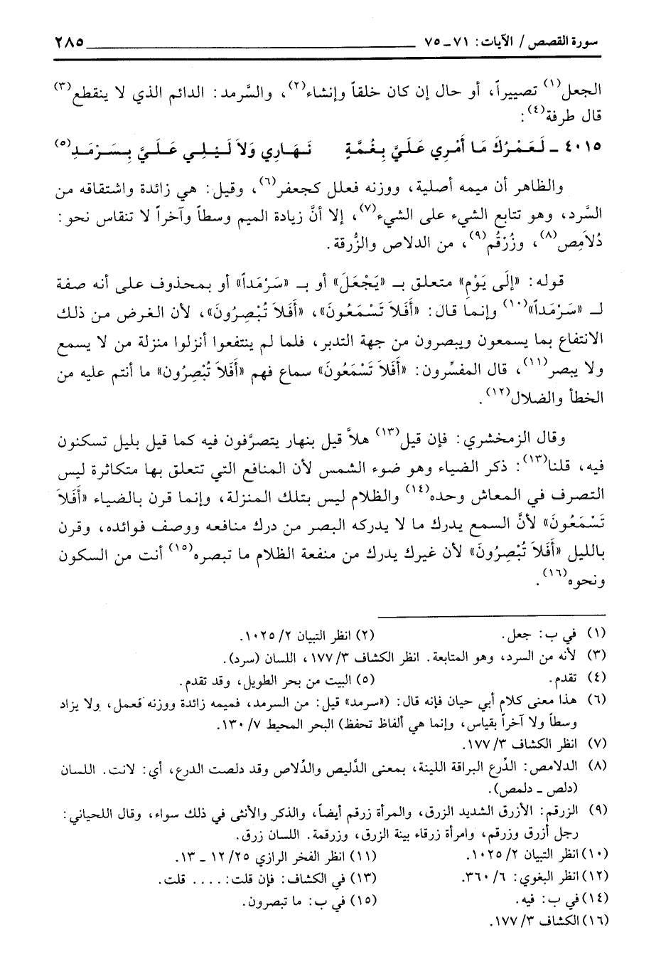قوله: «إلَى يَوْمِ» متعلق ب «يَجْعَلَ» أو ب «سَرْمَداً» أو بمحذوف على أنه صفة ل «سَرْمَداً» وإنما قال: «أَفَلاَ تَسْمَعُونَ» ، «أَفَلاَ تُبْصِرُونَ» ، لأن الغرض من ذلك الانتفاع بما يسمعون ويبصرون من جهة التدبر، فلما لم ينتفعوا أنزلوا منزلة من لا يسمع ولا يبصر، قال المفسِّرون: «أَفَلاَ تَسْمَعُونَ» سماع فهم «أَفَلاَ تُبْصِرُونَ» ما أنتم عليه من الخطأ والضلال.