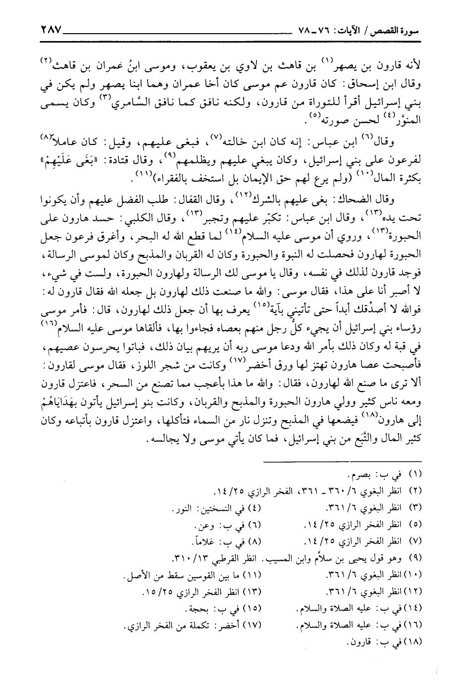 وقال ابن عباس: إنه كان ابن خالته، فبغى عليهم، وقيل: كان عاملاً لفرعون على بني إسرائيل، وكان يبغي عليهم ويظلمهم، وقال قتادة: «بَغَى عَلَيْهِمْ» بكثرة المال (ولم يرع لهم حق الإيمان بل استخف بالفقراء) .