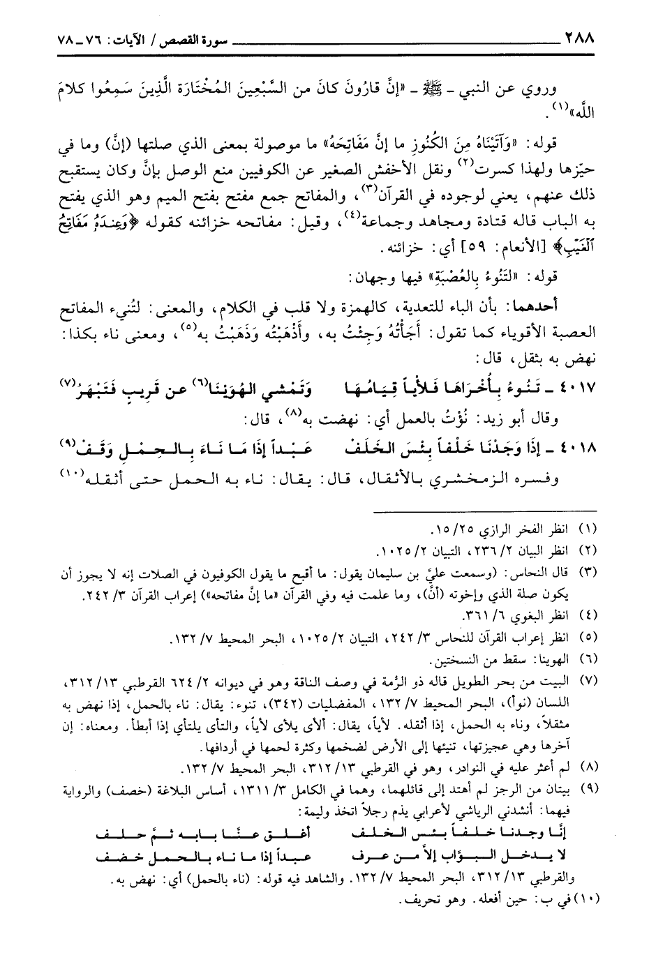 قوله: {وَآتَيْنَاهُ مِنَ الكنوز مَآ إِنَّ مَفَاتِحَهُ} ما موصولة بمعنى الذي صلتها (إنَّ) وما في حيّزها ولهذا كسرت ونقل الأخفش الصغير عن الكوفيين منع الوصل بإنَّ وكان يستقبح ذلك عنهم، يعني لوجوده في القرآن، والمفاتح جمع مفتح بفتح الميم وهو الذي يفتح به الباب قاله قتادة ومجاهد وجماعة، وقيل: مفاتحه خزائنه كقوله {وَعِندَهُ مَفَاتِحُ الغيب} [الأنعام: 59] أي: خزائنه.