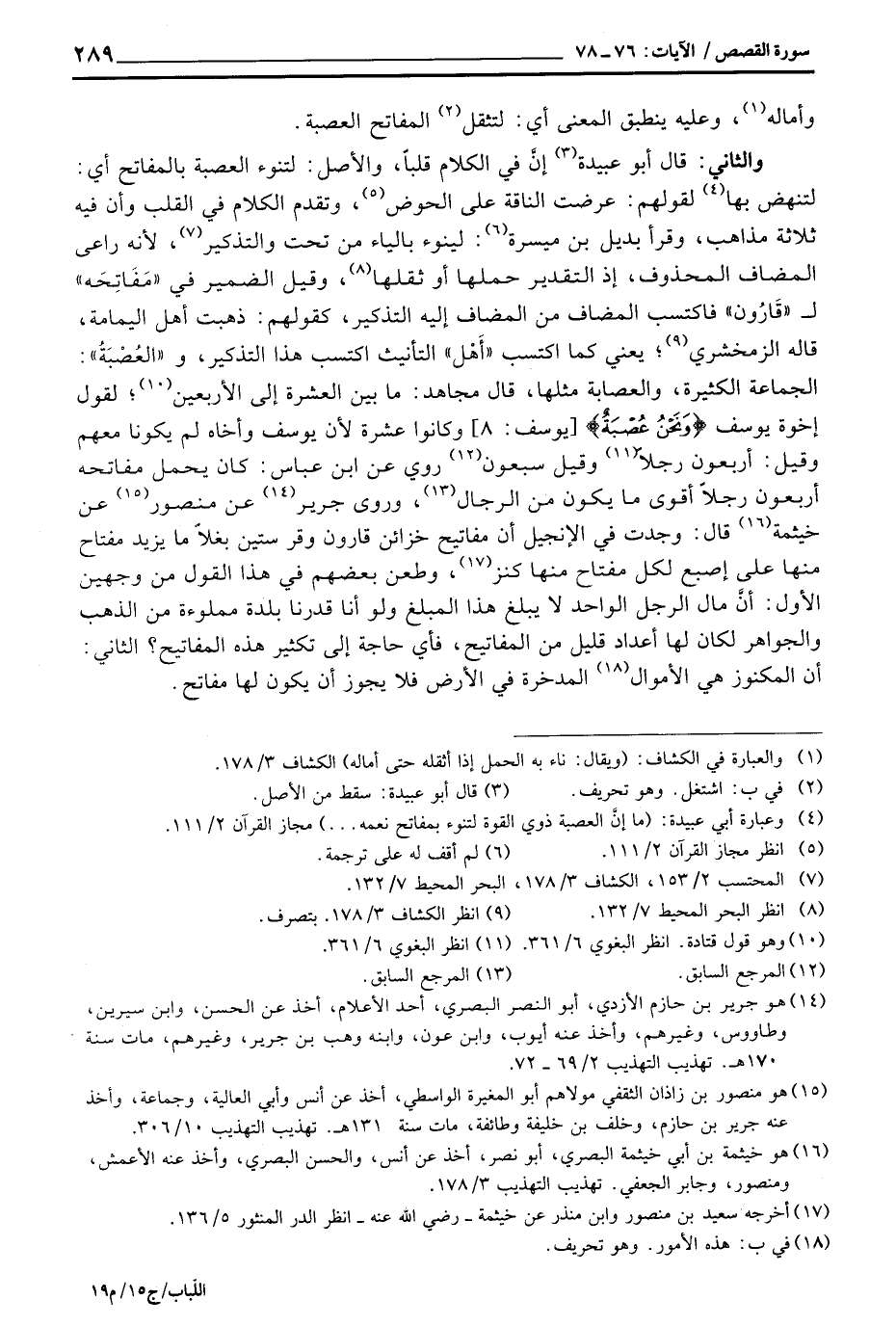 والثاني: قال أبو عبيدة إنَّ في الكلام قلباً، والأصل: لتنوء العصبة بالمفاتح أي: لتنهض بها لقولهم: عرضت لناقة على الحوض، وتقدم الكلام في القلب وأن فيه ثلاثة مذاهب، وقرأ بديل بن ميسرة: لينوء بالياء من تحت والتذكير، لأنه راعى المضاف المحذوف، إذ التقدير حملها أو ثثقلها، وقيل الضمير في «مَفَاتِحَه» ل «قَارُونَ» فاكتسب المضاف من المضاف إليه التذكير، كقولهم: ذهبت أهل اليمامة، قاله الزمخشري؛ يعني كما اكتسب «أَهْل» التأنيث اكتسب هذا التذكير، و «العُصْبَةُ» : الجماعة الكثيرة، والعصابة مثلها، قال مجاهد: ما بين العشرة إلى الأربعين؛ لقول إخوة يوسف {وَنَحْنُ عُصْبَةٌ} [يوسف: 8] وكانوا عشرة لأن يوسف وأخاه لم يكونا معهم وقيل: أربعون رجلاً وقيل سبعون روي عن ابن عباس: كان يحمل مفاتحه أربعون رجلاً أقوى ما يكون من الرجال، وروى جرير عن منصور عن خيثمة قال: وجدت في الإنجيل أن مفاتيح خزائن قارون وقر ستين بغلاً ما يزيد مفتاح منها على إصبع لكل مفتاح منها كنز، وطعن بعضهم في هذا القول من وجهين الأول: انَّ مال الرجل الواحد لا يبلغ هذا المبلغ ولو أنا قدرنا بلدة مملوءة من الذهب والجواهر لكان لها أعداد قليل من المفاتيح، فأي حاجة إلى تكثير هذه المفاتيح؟ الثاني: أن المكنوز هي الأموال المدخرة في الأرض فلا يجوز أن يكون لها مفاتح.