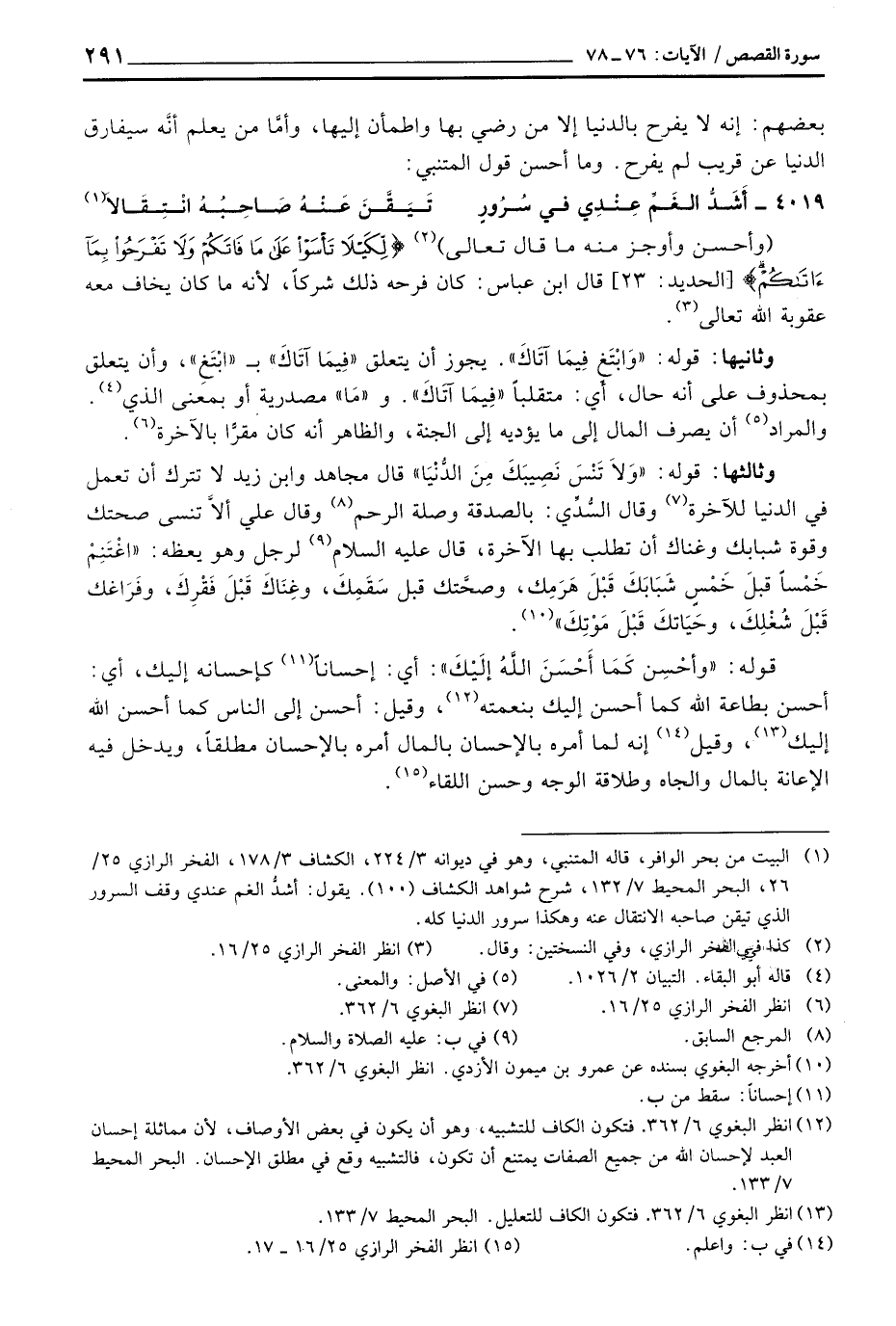وثالثها: قوله: {وَلاَ تَنسَ نَصِيبَكَ مِنَ الدنيا} قال مجاهد وابن زيد لا تترك أن تعمل في الدنيا للآخرة وقال السُّدِّي: بالصدقة وصلة الرحم وقال علي ألاَّ تنسى صحتك وقوة شبابك وغناك أن تطلب بها الآخرة، «قال عليه السلام لرجل وهو يعظه:» اغْتَنِمْ خَمْساً قبلَ خَمْسٍ شَبَابَكَ قَبْلَ هَرَمِك، وصحَّتك قبل سَقَمِكَ، وغِنَاكَ قَبْلَ فَقْرِكَ، وفَرَاغك قَبْلَ شُغْلِكَ، وحَيَاتكَ قَبْلَ مَوْتِكَ «